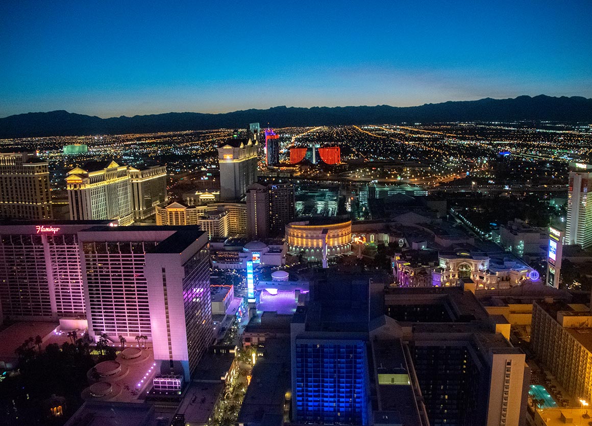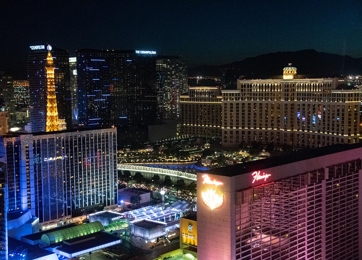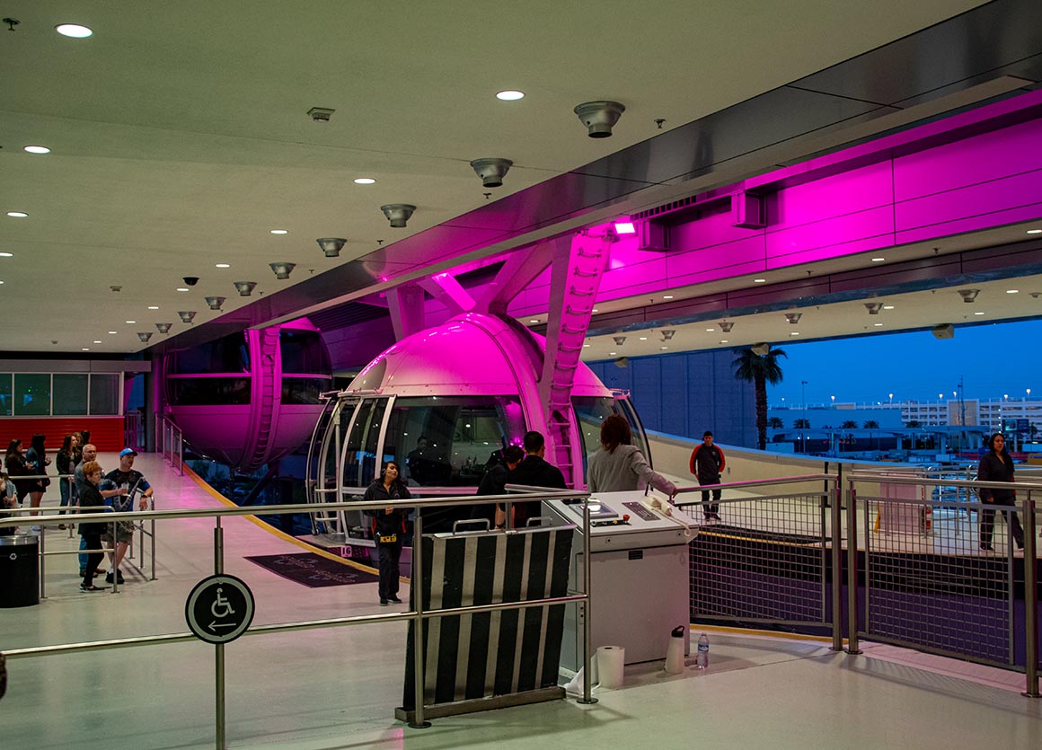 Den Zeitpunkt hätten wir nicht besser wählen können. Wir fahren bei Dämmerung hinauf, und als es wieder hinuntergeht, ist es bereits ziemlich dunkel. Obwohl der High Roller etwas abseits vom Strip steht, bietet der höchste Punkt einen fantastischen Panoramablick über nahezu den gesamten Strip. Einfach wunderbar! Über Bildschirme erhalten wir auf sympathische Weise Informationen über die Fahrt. Las Vegas hat hier wirklich eine beeindruckende neue Attraktion geschaffen. Ich kann die Fahrt nur wärmstens empfehlen!