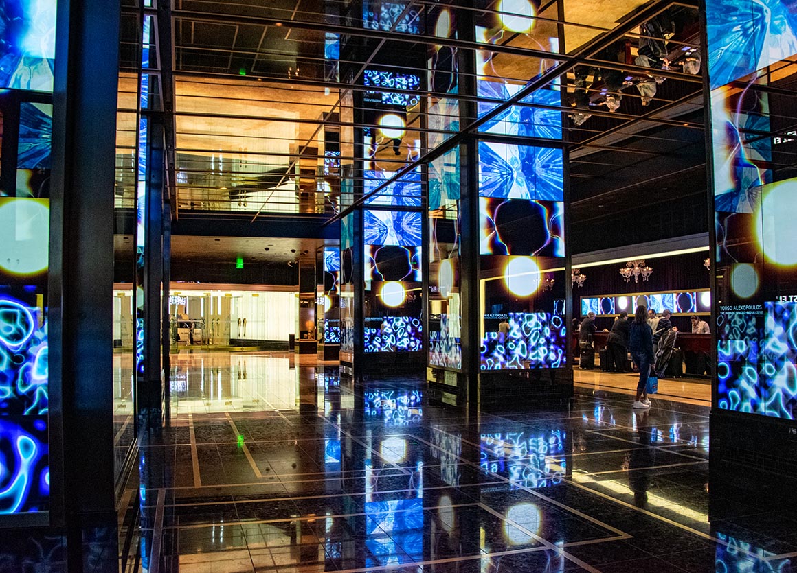 Das Cosmopolitan selbst ist ein Paradebeispiel für Modernität und Chic, und das unterscheidet es wirklich von den typischen Casinos. Hier gibt es keine grellen Lichter, sondern einen Hauch von Eleganz, der die Sinne anspricht. Und lasst mich euch von der Lobby erzählen – mit ihren acht riesigen Säulen, die insgesamt 408 HD-LED-Panels beherbergen. Diese werden von nicht weniger als 90 PCs gesteuert und zaubern ständig wechselnde, faszinierende Themen in die Lobby. Ein Spektakel für die Augen, das einem das Gefühl gibt, in einem futuristischen Märchen gelandet zu sein.