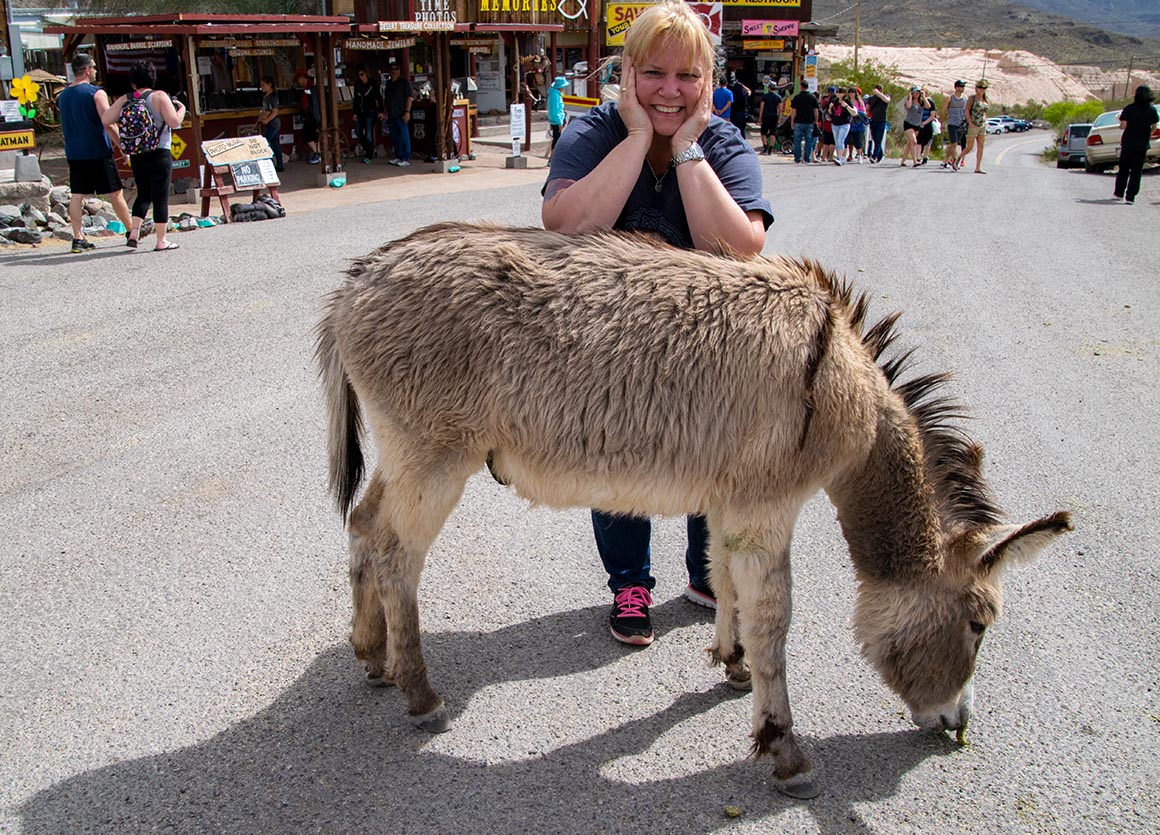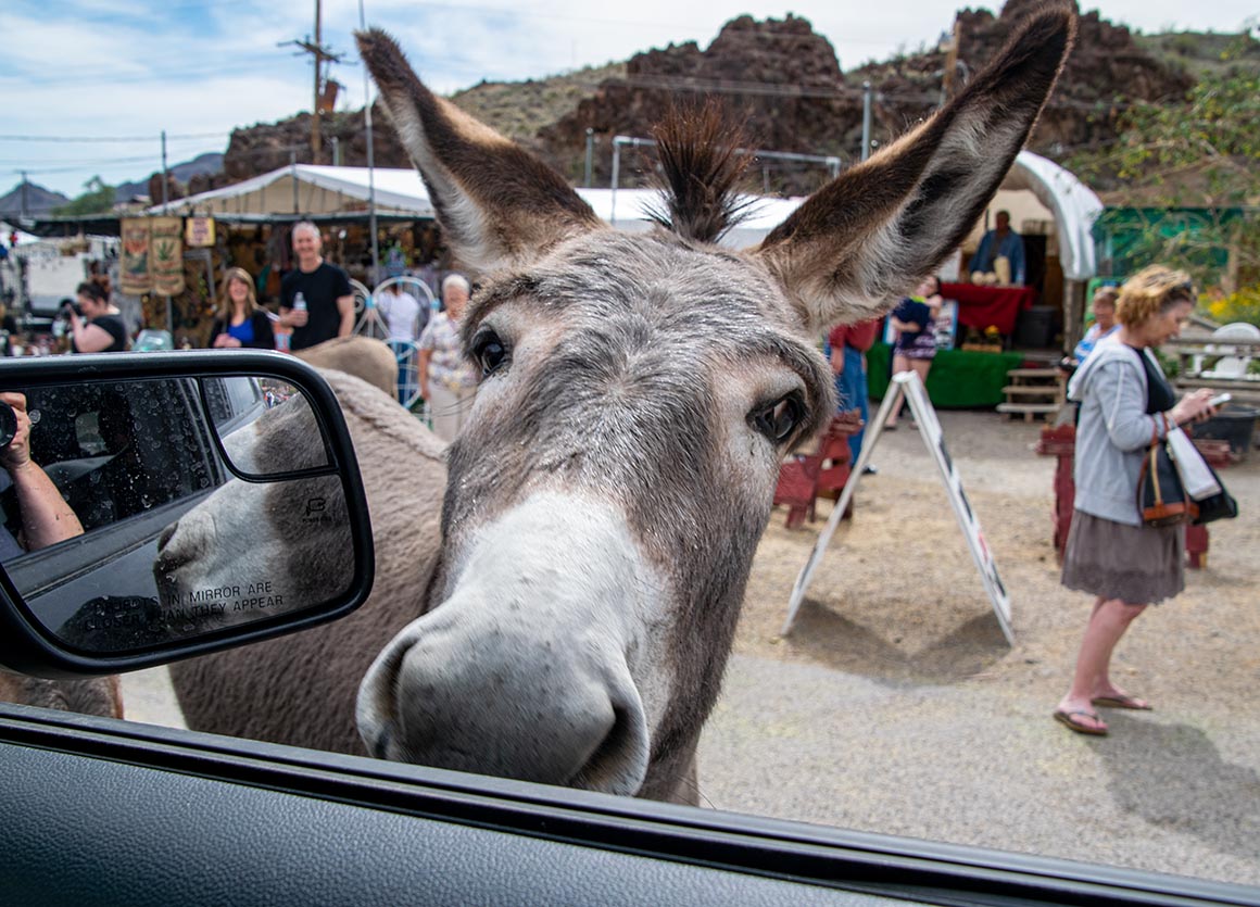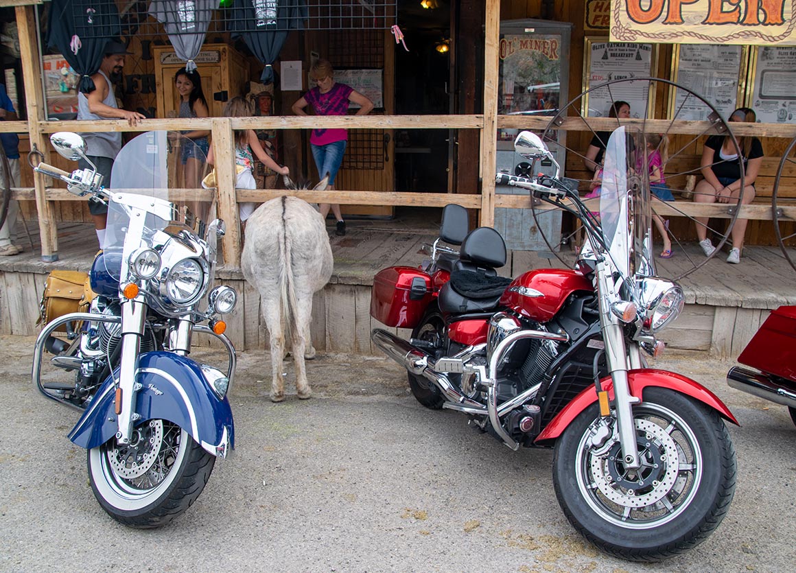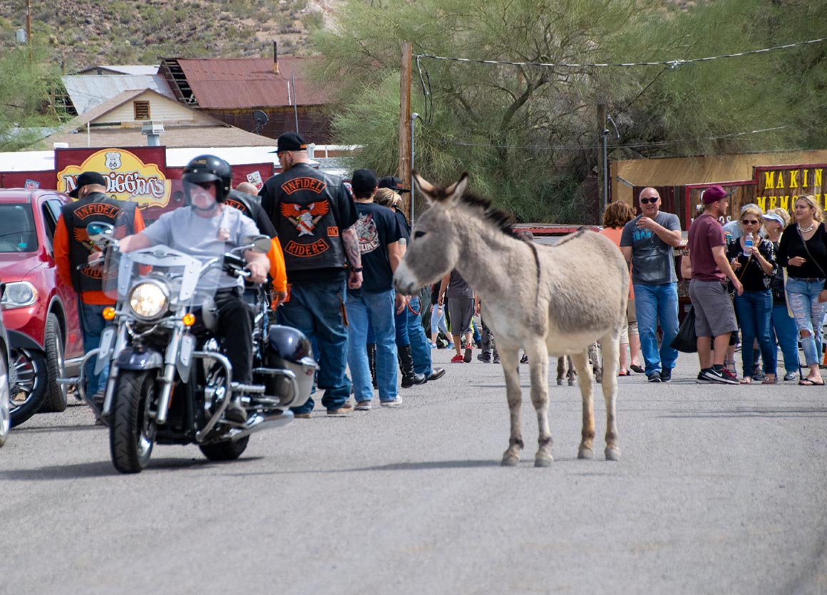 Die Main Street in Oatman hat definitiv eine skurrile Note: Fußgänger, Motorradfahrer, Autofahrer und Esel teilen sich die Straße – wobei die Esel natürlich immer Vorfahrt genießen. Das führt gelegentlich zu längeren Staus, denn die Esel haben es nicht gerade eilig. Wenn sie beschließen, stehen zu bleiben, dann stehen sie. Egal, wie groß und breit die Harley oder der RAM-Pickup ist, der gerade vorbeifahren möchte. Die Esel lassen sich nicht beeindrucken.