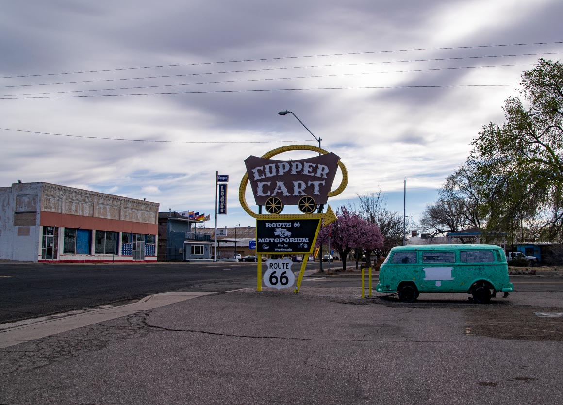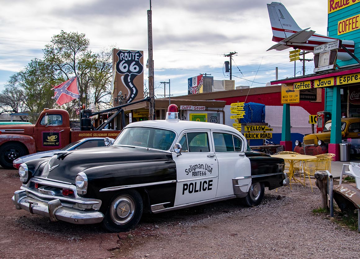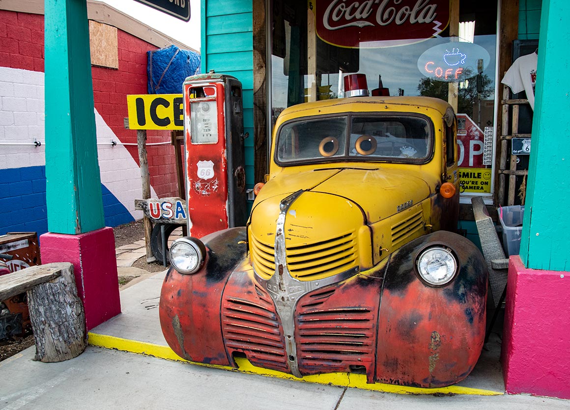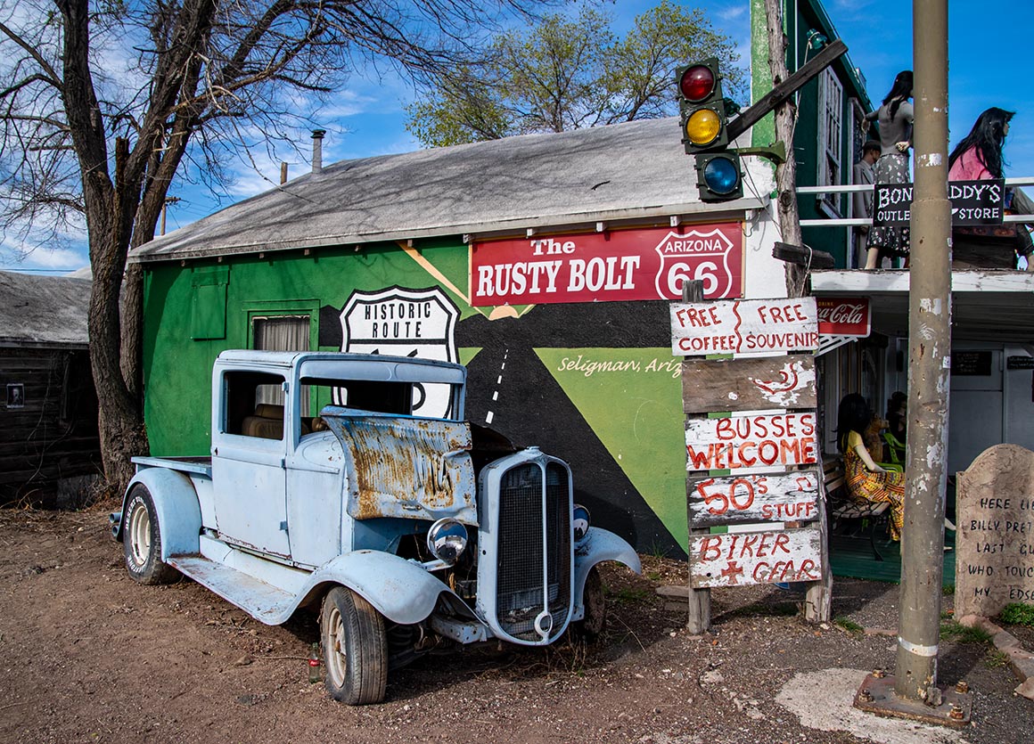 Unser erster Halt auf diesem nostalgischen Stück Asphalt ist also Seligman, stolz verkündet als die „Geburtsstätte der historischen Route 66“. Hier haben sie einige Tankstellen und Bars aus den 1950er und 1960er Jahren renoviert, als hätte Marty McFly gerade seine DeLorean in die Vergangenheit gesetzt. ✨