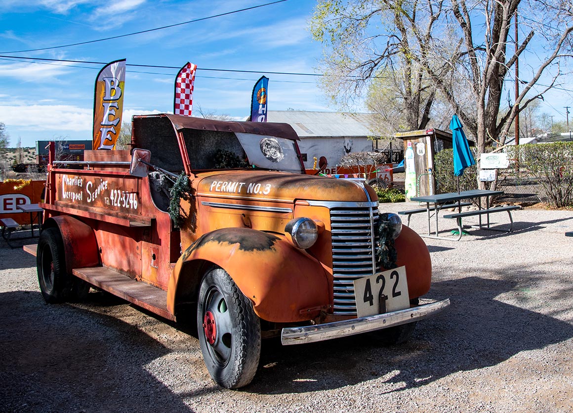 Nach weiteren 20 Meilen erreichen wir das legendäre Hackberry. Hier thront der berühmte Hackberry General Store. Es fühlt sich an, als hätten sie alles, was an verrostetem Nippes in der Gegend herumlag, hier liebevoll zusammengetragen. Wenn es rostet und den Hauch von „retro“ hat, dann wird es hier irgendwo ausgestellt – vor, hinter oder sogar in dem Shop. Schilder, alte Autoradios, Autowracks, you name it.
