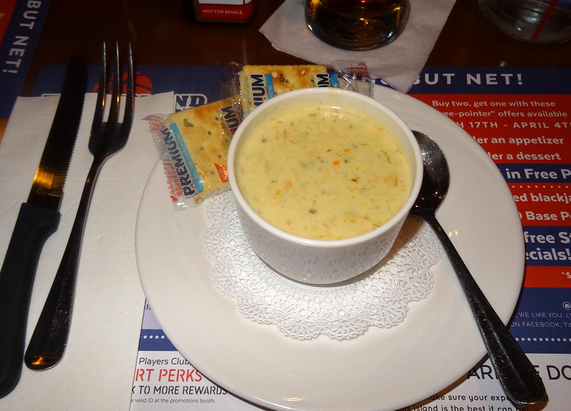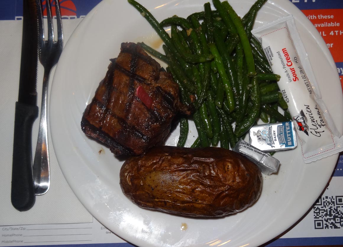Und weil ein Tag in Vegas nicht komplett ist ohne ein weiteres Abenteuer, beschließen wir, auch beim Abendessen ein echtes Schnäppchen zu ergattern. Unser Ziel: das Ellis Island Casino. Hier gibt es einen „Steak-Deal“, der zwar nicht auf der regulären Karte steht, aber für Mitglieder des Players Club winkt da ein verlockender Coupon!