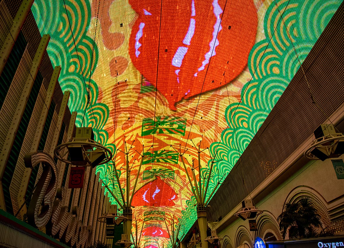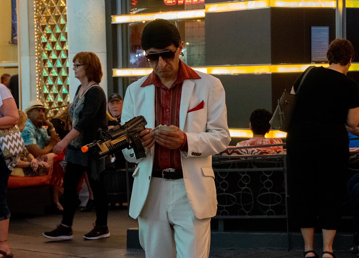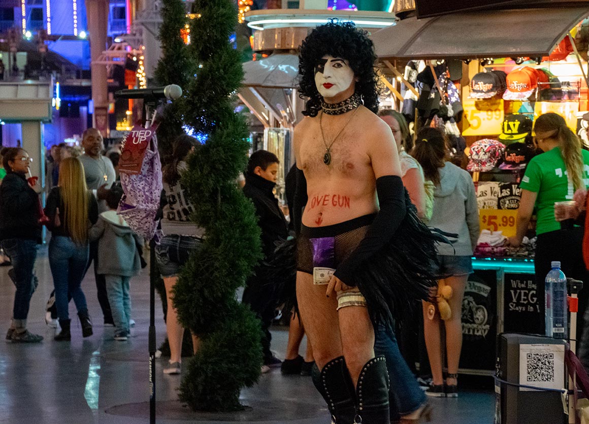 Wir schlendern die Fremont Street entlang bis zum Ende und begegnen erneut vielen skurrilen bis verstörenden „Künstlern“. Aber das absolute Highlight des Abends war dieser Typ mit dem dicken Bauch. Er trägt nur einen Hut und eine kurze Hose – und irgendwie ist das für ihn die perfekte Kombi. Ein Passant gibt ihm einen Dollar, und plötzlich fängt er an, völlig irre herumzuzappeln. Ich meine, ich habe schon einiges gesehen, aber das toppt alles. Da bleibt einem echt die Spucke weg. Fremont Street, du machst uns sprachlos – im wahrsten Sinne des Wortes!