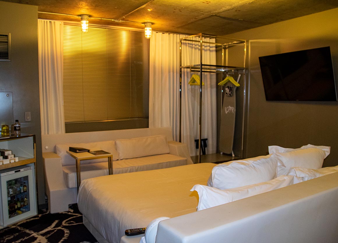 Das Bettgestell und das kleine Sofa waren aus weißem Plastik und wirkten extrem billig. Immerhin war das Sofa beleuchtet. Ja, wir hatten ein beleuchtetes Sofa.