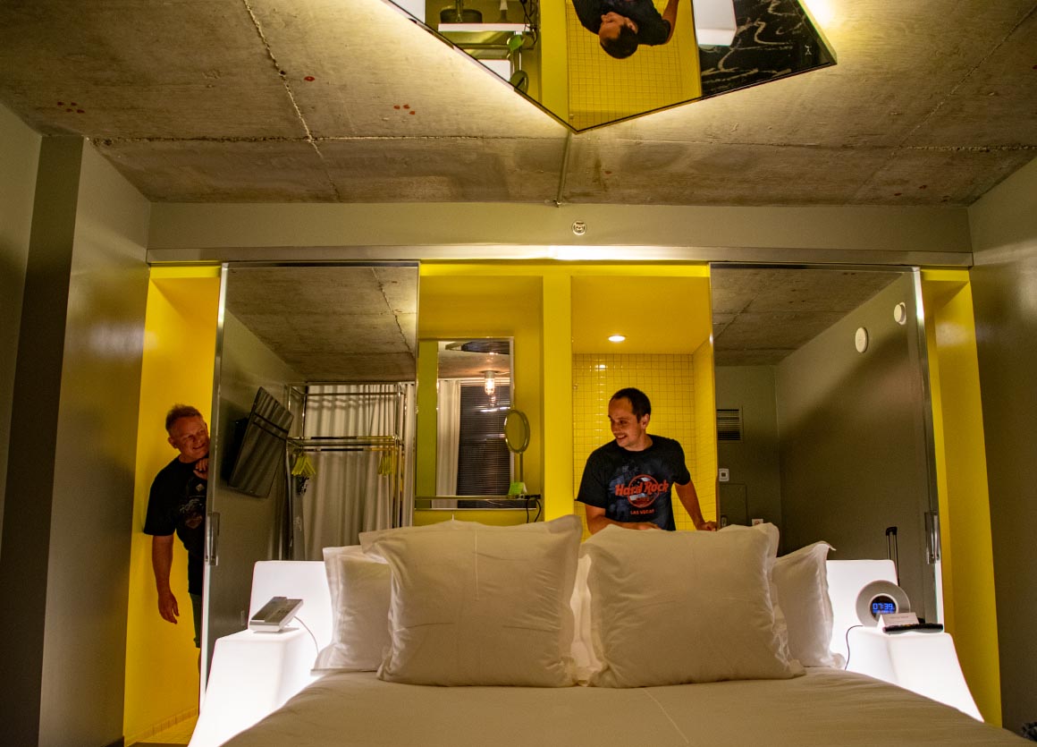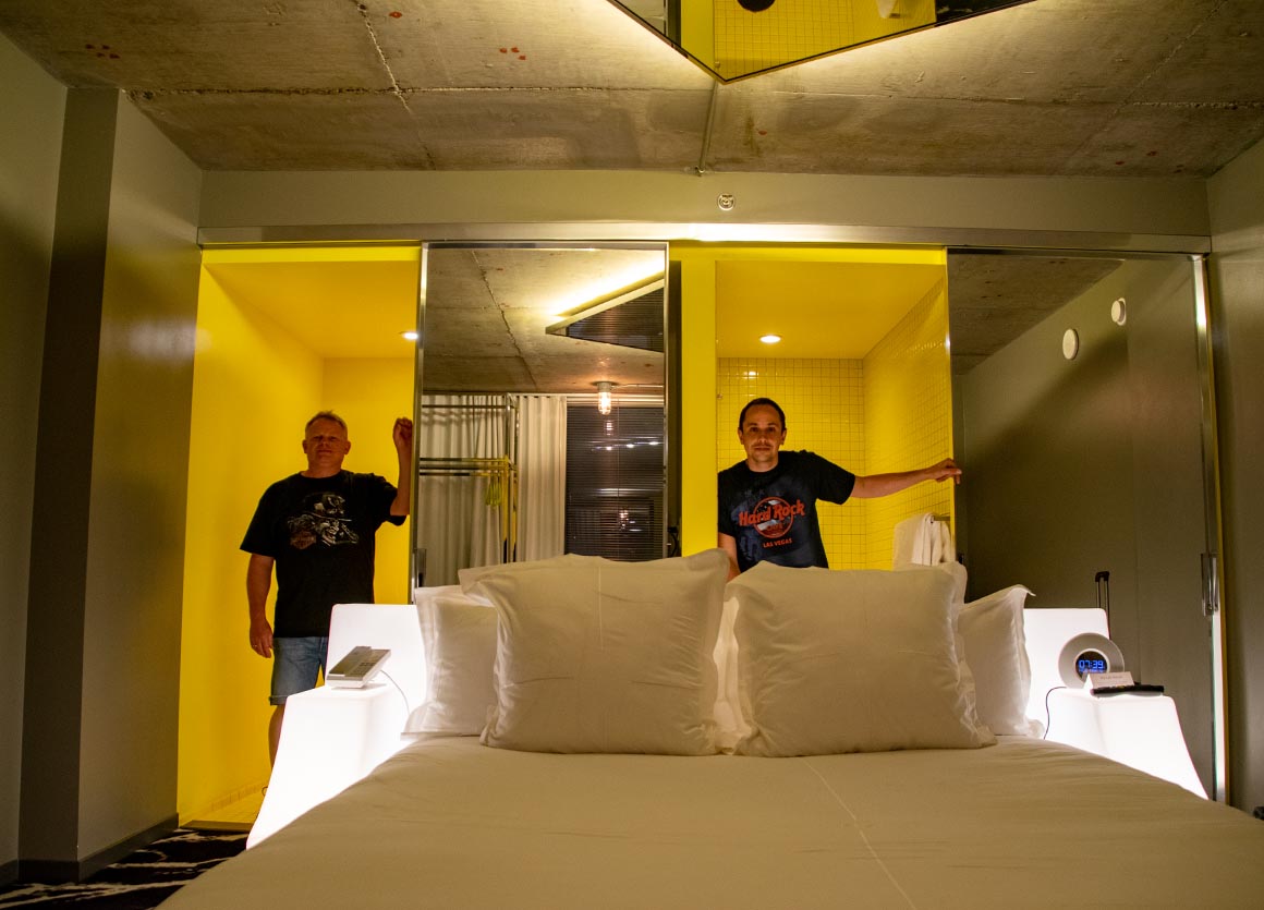 Die Zimmer befanden sich auf der achten Etage mit Blick auf die Klimaanlage. Na ja, was soll’s. Aber was war das für eine Zimmerausstattung? Modern ist ja okay, ehrlich gesagt, ich mag es eigentlich ganz gerne, wenn etwas stylisch ist. Aber das?! Das Zimmer hatte eine unbehandelte Betondecke und war ansonsten in Gelb gehalten. Das war eigentlich ganz okay, aber weil das Zimmer so klein war, wurde nicht an Spiegeln gespart. Die „Schranktüren“ und der gesamte Bereich um das Waschbecken waren von der Decke bis zum Boden mit Spiegeln ausgestattet – über dem Bett hing ebenfalls ein riesiger Spiegel. Neben dem Fenster befand sich eine Kleiderstange. Doch wo zum Teufel war Dusche und Toilette?!