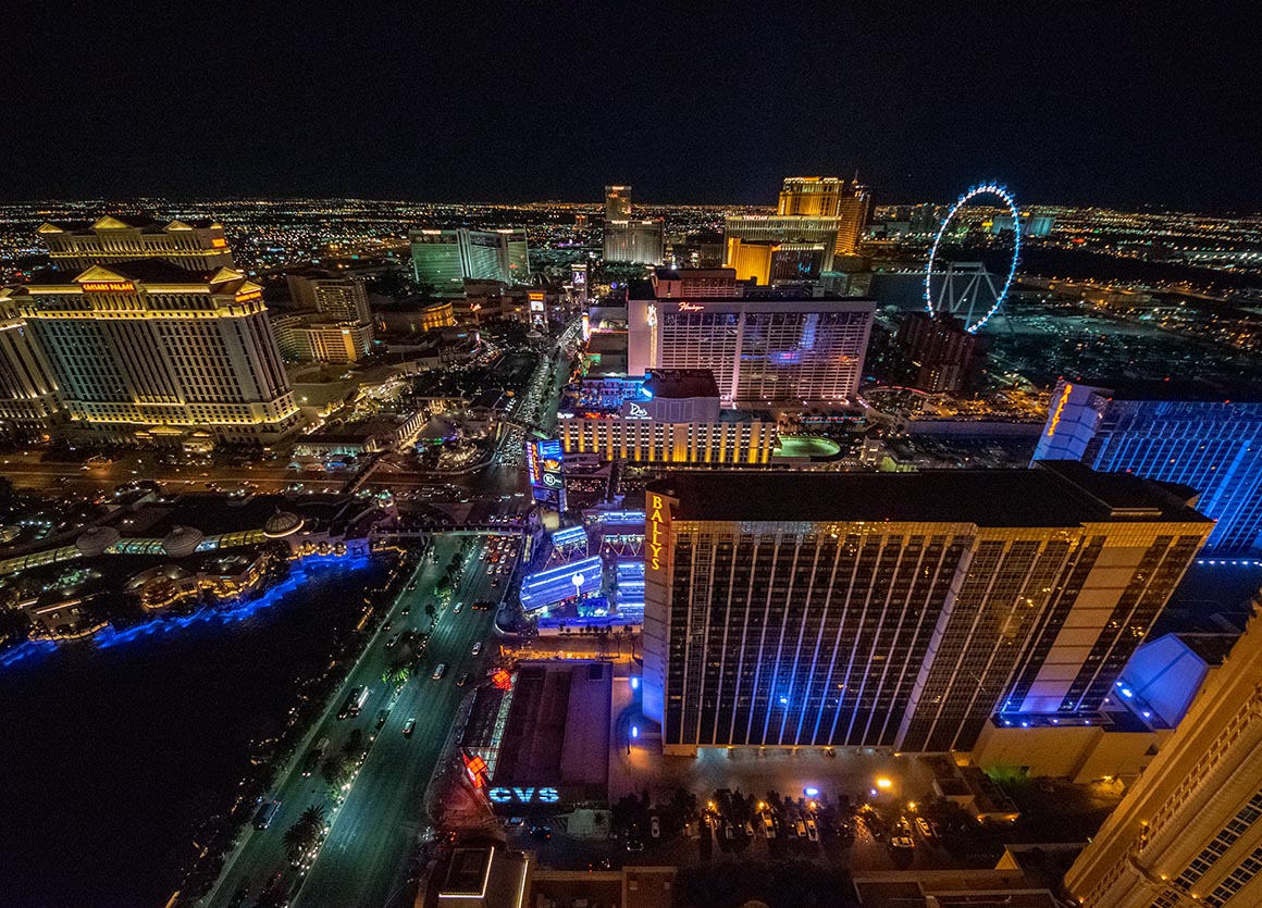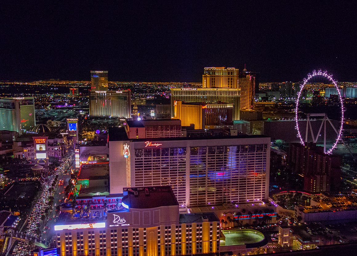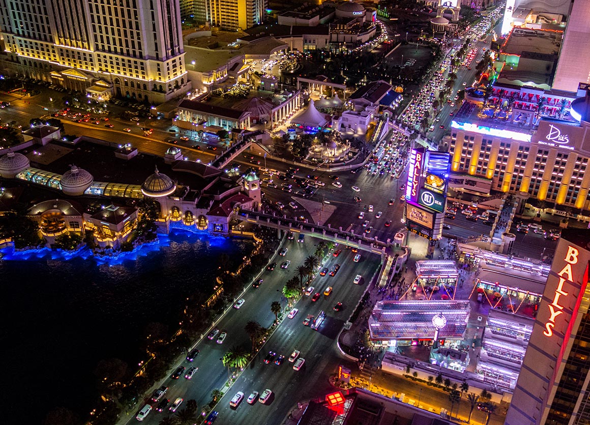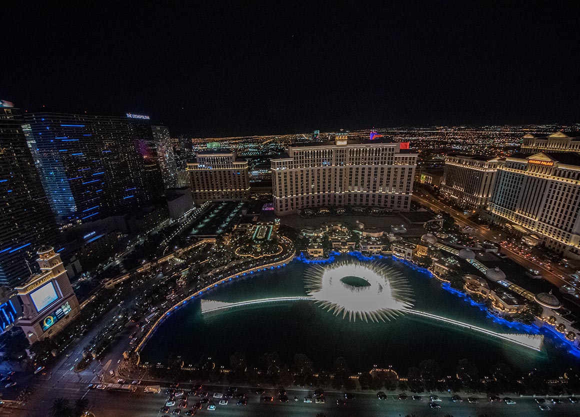 Von hier oben liegt uns der Strip zu Füßen, und unser Blick fällt direkt auf die Bellagio Fountains. Von dieser Perspektive wirken sie noch eleganter, fast choreografiert für uns allein. Und ja – man hört sogar die Musik. Las Vegas versteht eben etwas von Inszenierung.