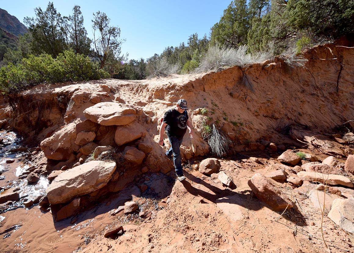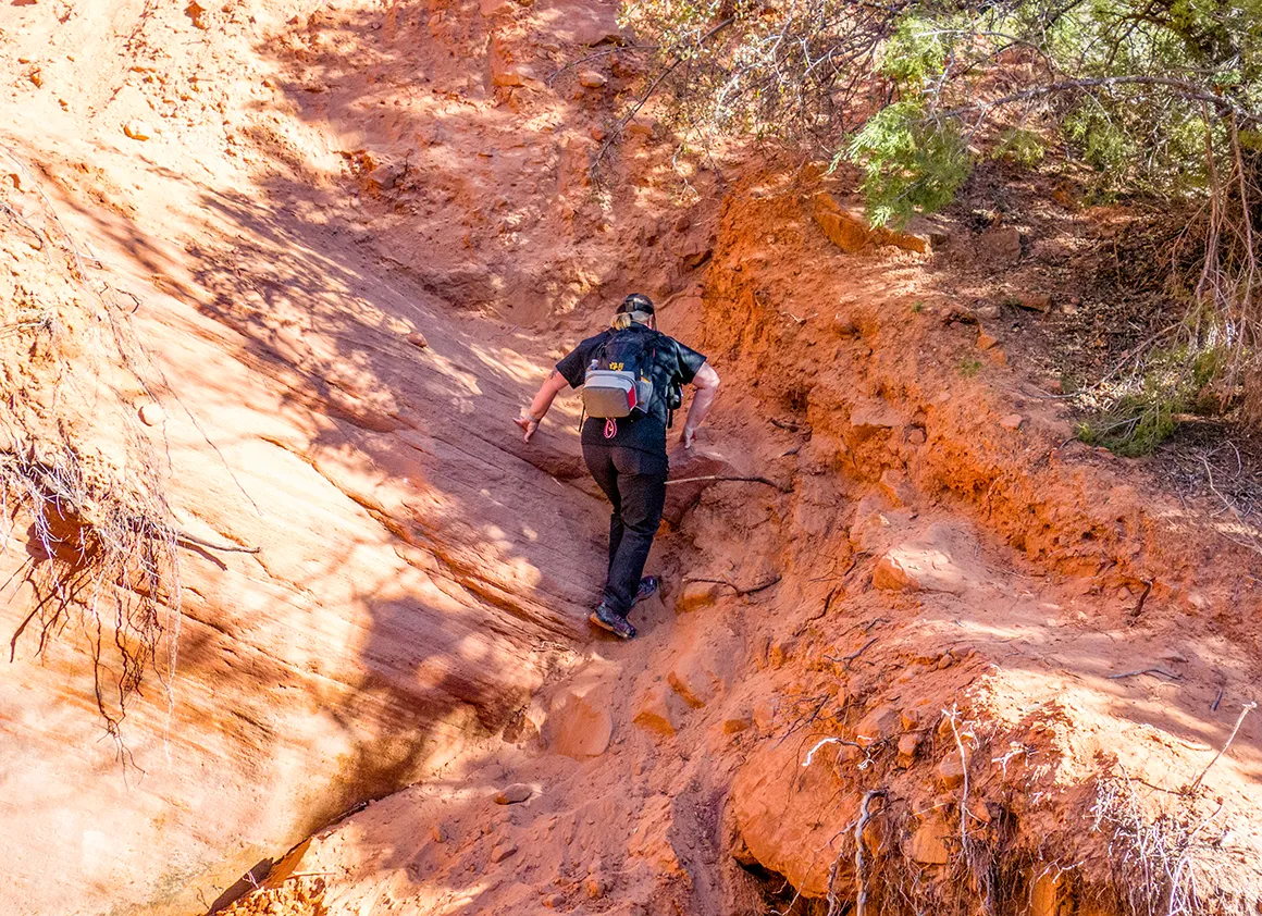 Der Trail folgt dem Short Creek, den wir gleich zweimal überqueren dürfen. Kein Drama, eher ein willkommener Kontrast zum Sand. Wasser, Steine, kurz Balance halten – dann wieder trockene Füße und weiter. Nach der zweiten Querung wird der Weg spürbar angenehmer. Wir bewegen uns nun etwas oberhalb des Bachlaufs, der Pfad wird schmaler, führt durch Gestrüpp und Geröll und schenkt uns mit jedem Höhenmeter mehr Aussicht.