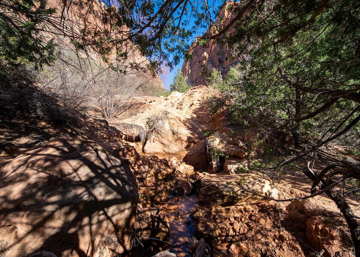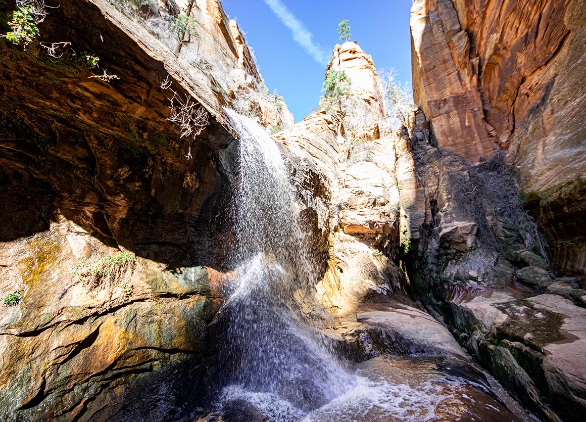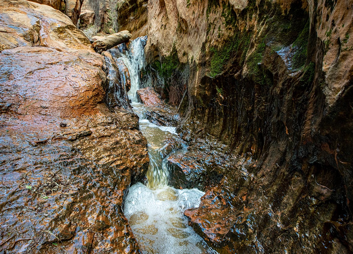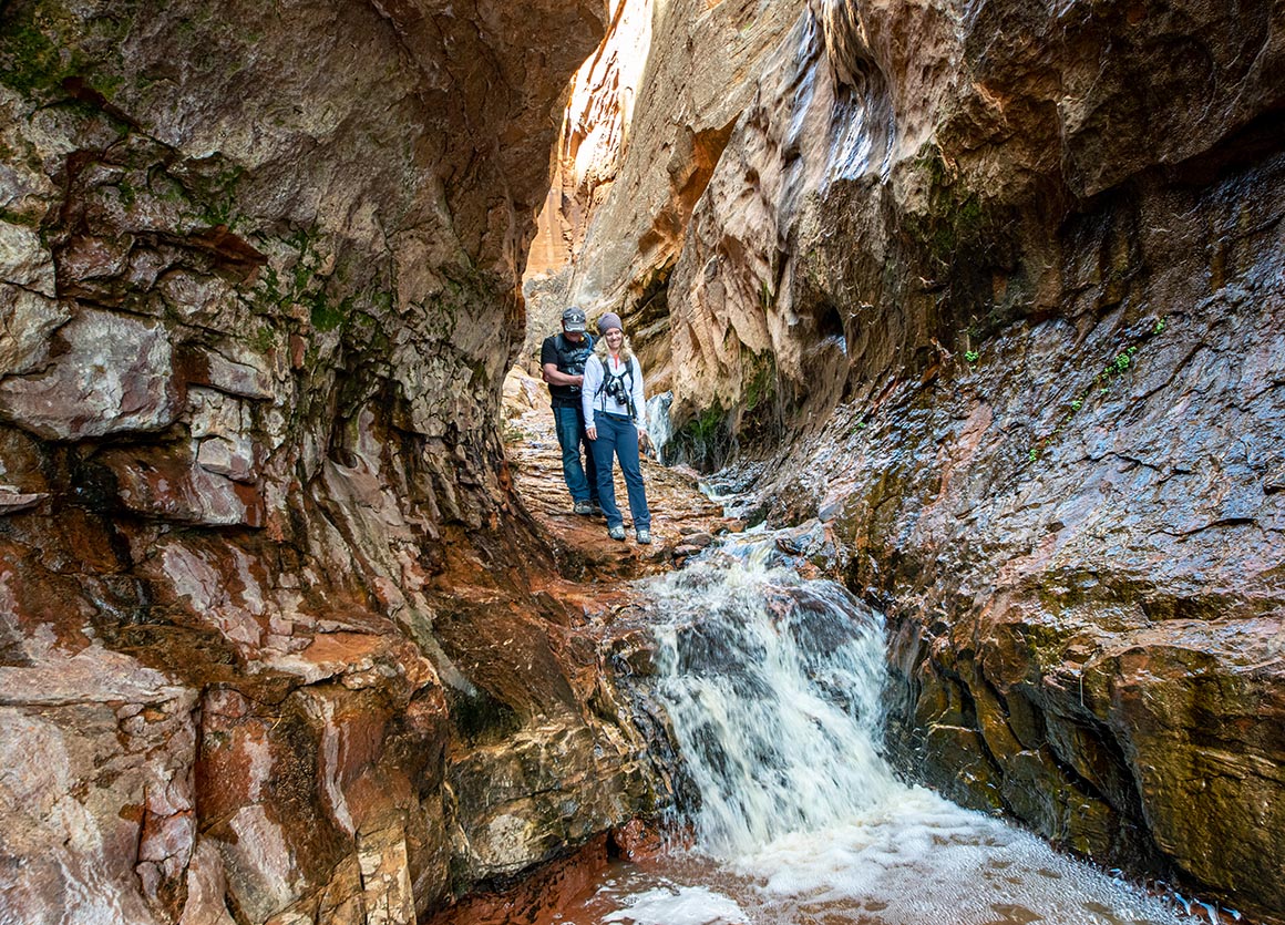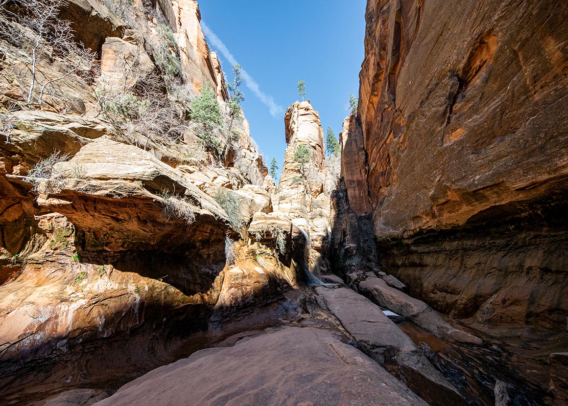 Jetzt stehen wir zwischen hohen Felswänden, lauschen dem Rauschen des Wassers und lassen den Blick schweifen. Vor uns leuchten rote Buttes im Sonnenlicht, hinter uns liegt die grüne Schlucht, aus der wir gerade gekommen sind. Und mittendrin dieser Ort, der sich plötzlich ganz anders anfühlt: dunkler, enger, fast mystisch. Ein Slot Canyon, durchzogen von Wasserläufen, mit Wänden, die Geschichten erzählen.