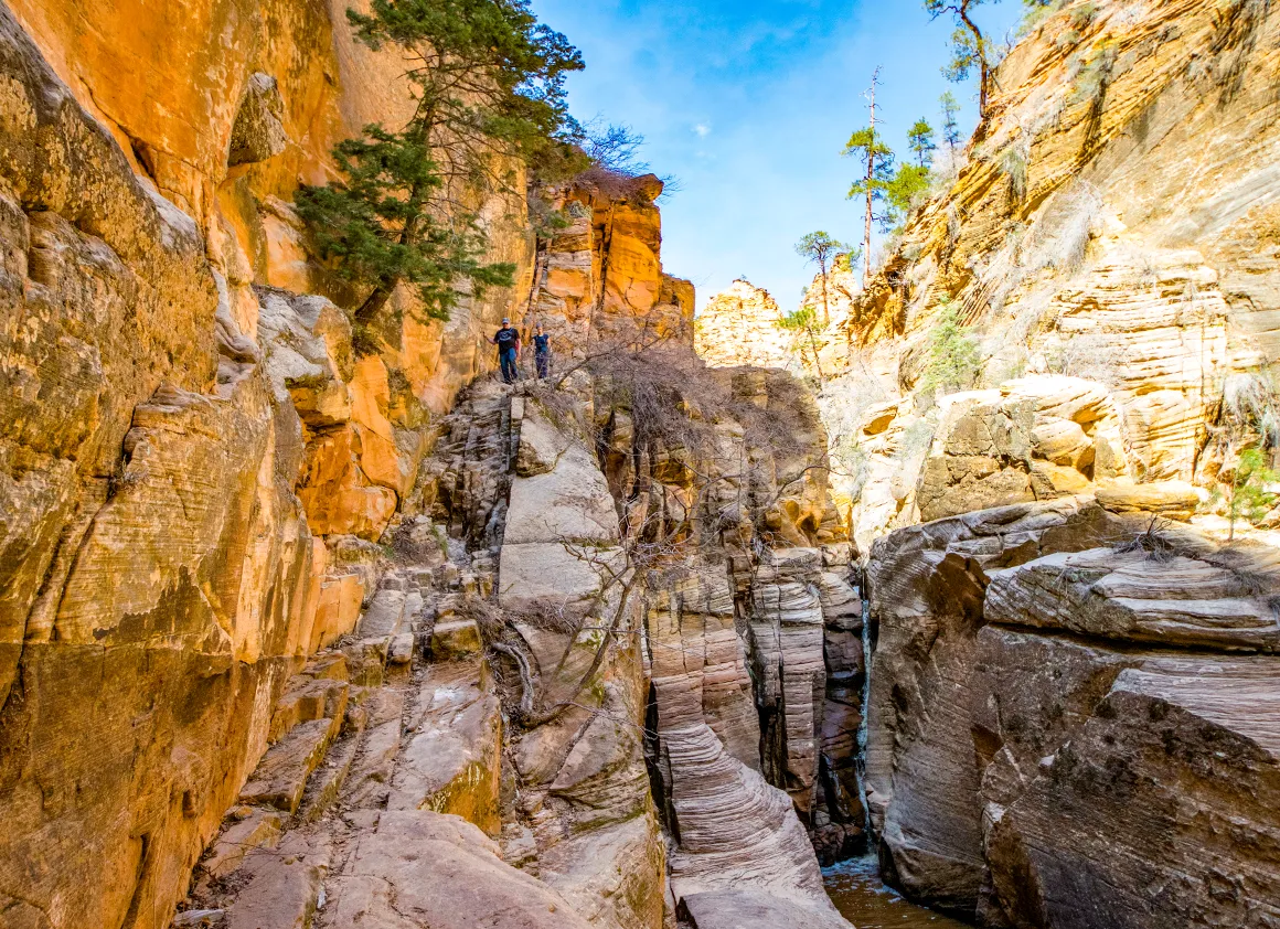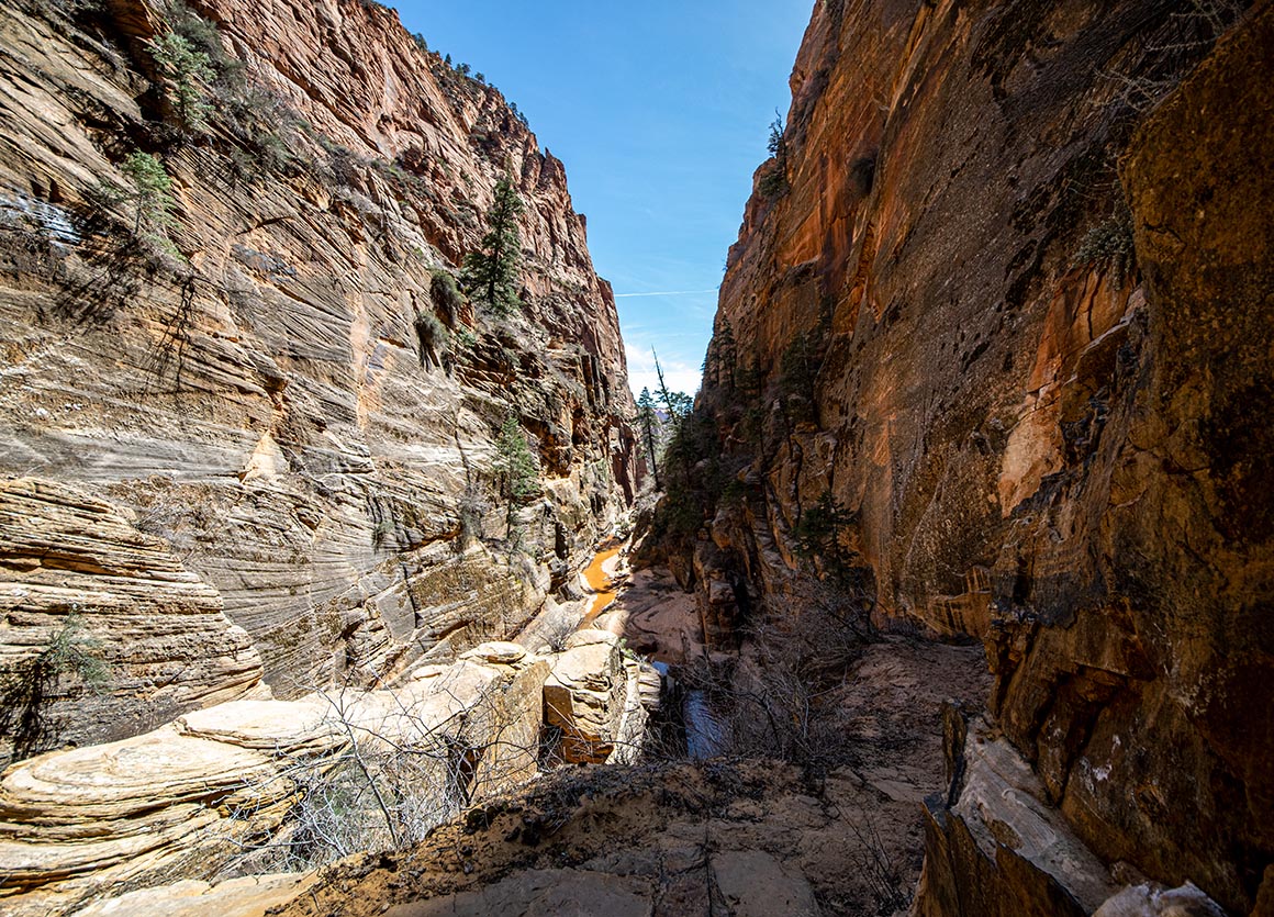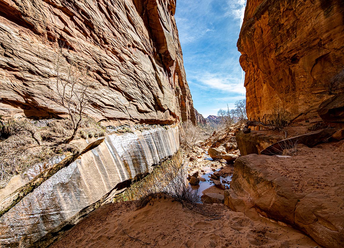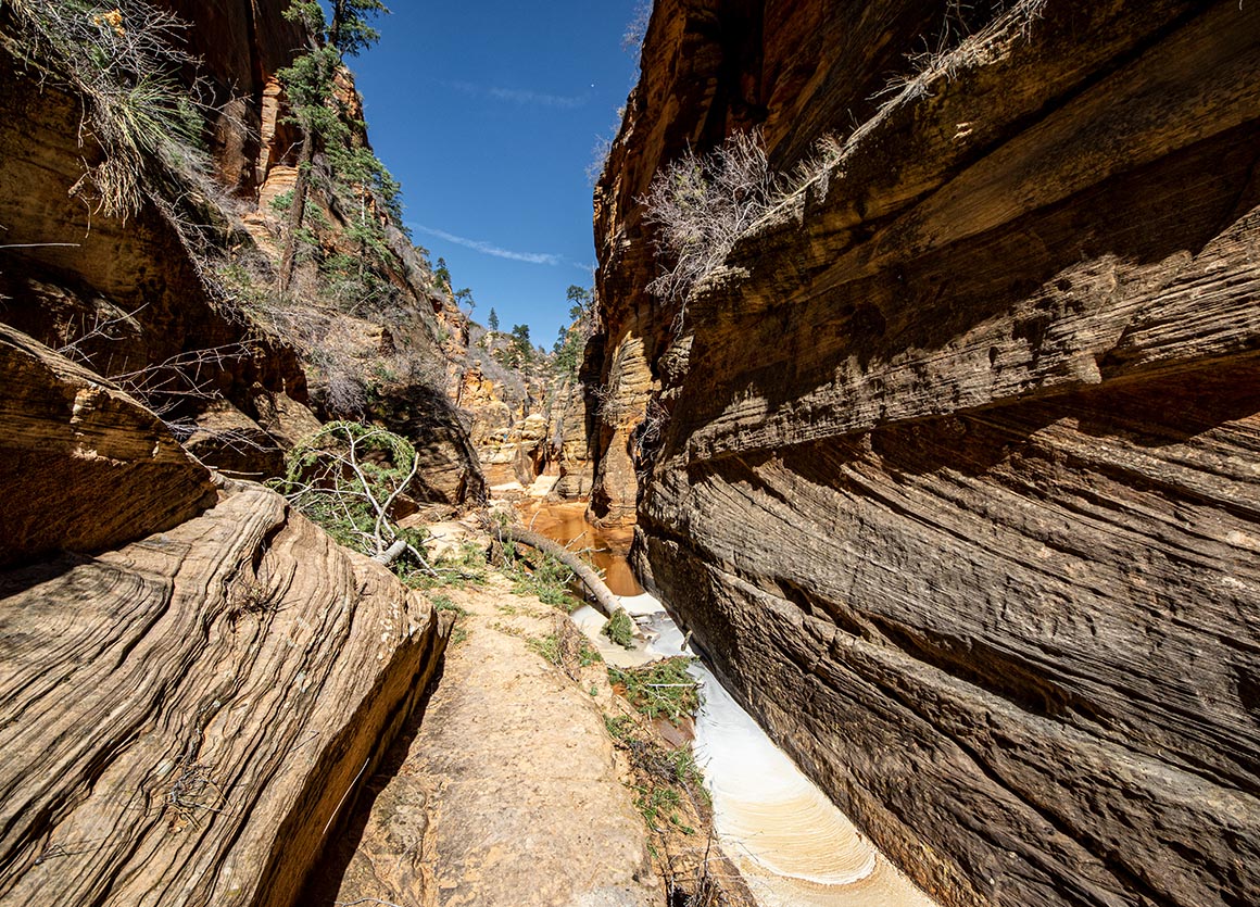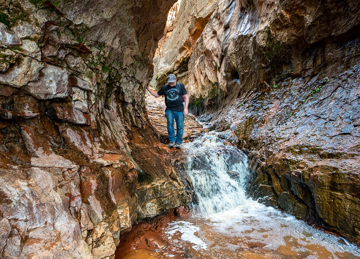 Jetzt stehen wir zwischen hohen Felswänden, lauschen dem Rauschen des Wassers und lassen den Blick schweifen. Vor uns leuchten rote Buttes im Sonnenlicht, hinter uns liegt die grüne Schlucht, aus der wir gerade gekommen sind. Und mittendrin dieser Ort, der sich plötzlich ganz anders anfühlt: dunkler, enger, fast mystisch. Ein Slot Canyon, durchzogen von Wasserläufen, mit Wänden, die Geschichten erzählen.