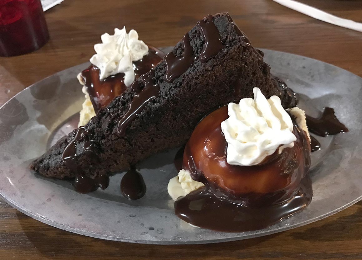 Auf Trinkets ausdrückliche Empfehlung bestellen wir den Hot Brownie mit Vanilleeis. Ein Nachtisch, der weniger Kalorienzahl als Lebenseinstellung ist. Warm, schokoladig, sündhaft – und vermutlich verantwortlich für mindestens drei sportfreie Tage. Aber genau so muss ein Abschied aussehen.