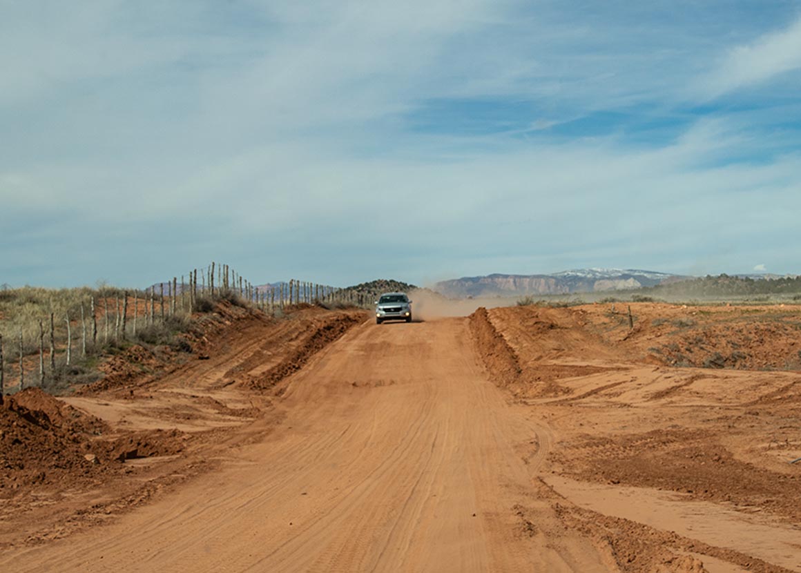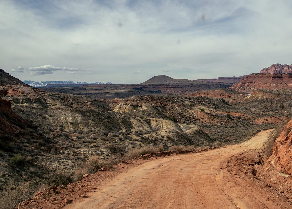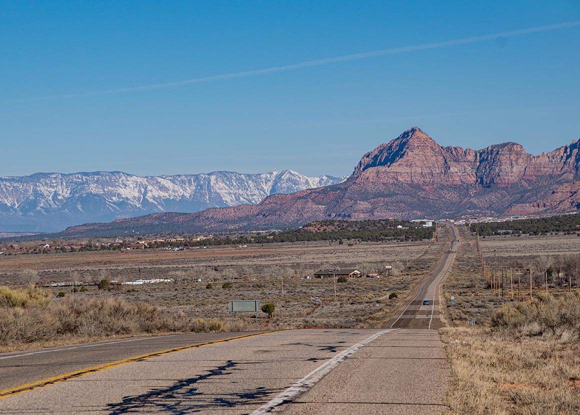 Wir verlassen Kanab und fahren südwärts durch Fredonia, das uns inzwischen fast schon vertraut vorkommt. Dann geht es weiter auf den Highway 389, Richtung Westen. Eine dieser Straßen, die auf der Karte harmlos aussehen, in Wirklichkeit aber genau das liefern, was man sich von Utah erhofft: Weite, klare Linien, Landschaft, die nicht versucht zu beeindrucken, sondern es einfach tut. Die Straße zieht sich schnurgerade durch die Ebene, im Hintergrund thronen Berge, deren Gipfel noch schneebedeckt sind. Ein Kontrast, der jedes Mal aufs Neue überrascht.