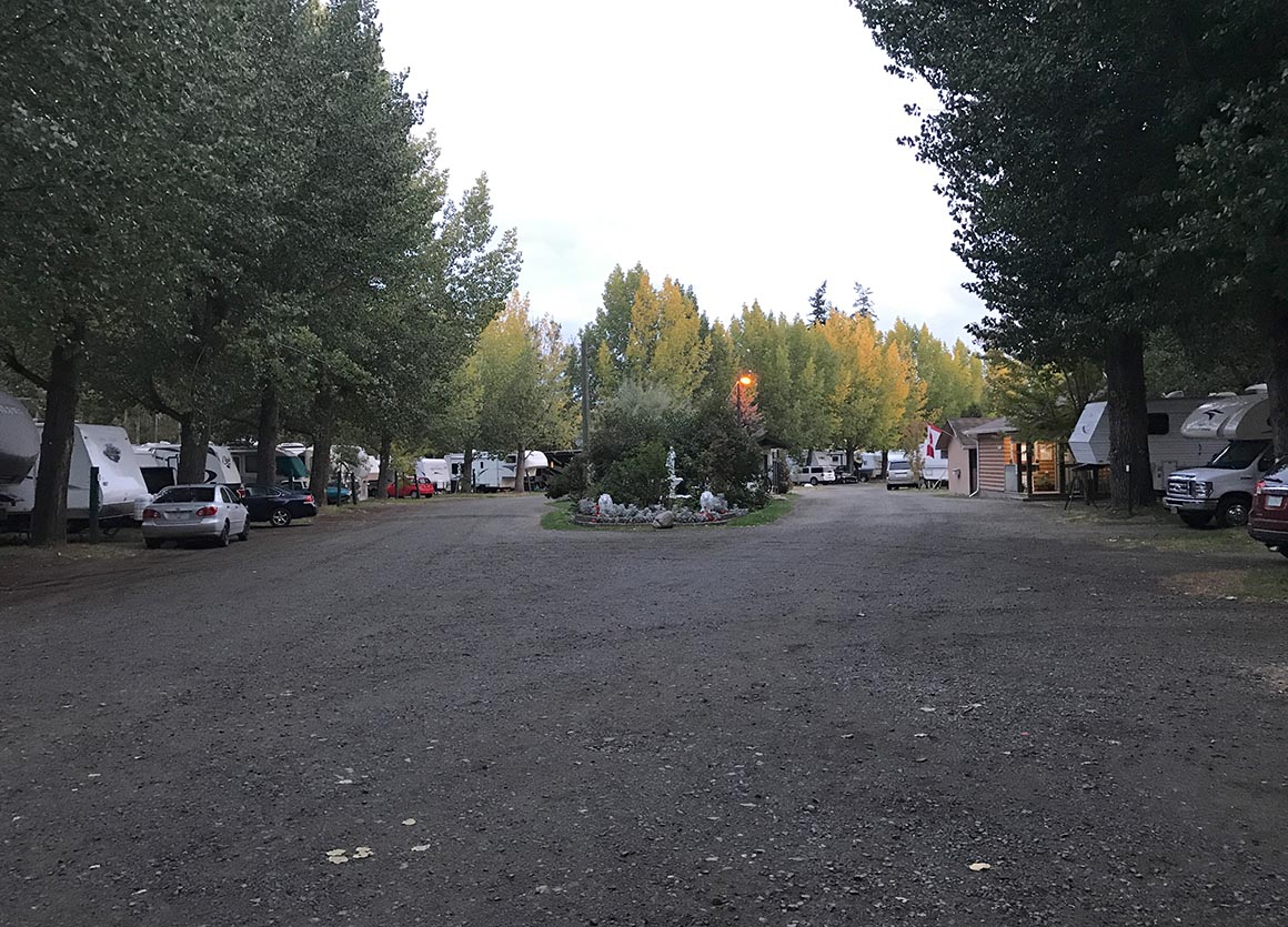 Der Knutsford RV Campground entpuppt sich als wahres Riesenareal. Das Office hat längst Feierabend, also stürzen wir uns auf den Self-Check-in. Ein Blick auf die Liste zeigt: Nur noch vier Plätze sind frei – fast ausgebucht also. Kein Wunder, der Platz wirkt wie ein kleines Dorf. Manche Camper haben sich hier regelrecht eingerichtet: Teppiche vor dem Eingang, Blumenkübel und – ungelogen – jemand hat tatsächlich Palmen aufgestellt. Man könnte fast meinen, wir wären auf einem Campingplatz in Florida und nicht mitten in Kanada.