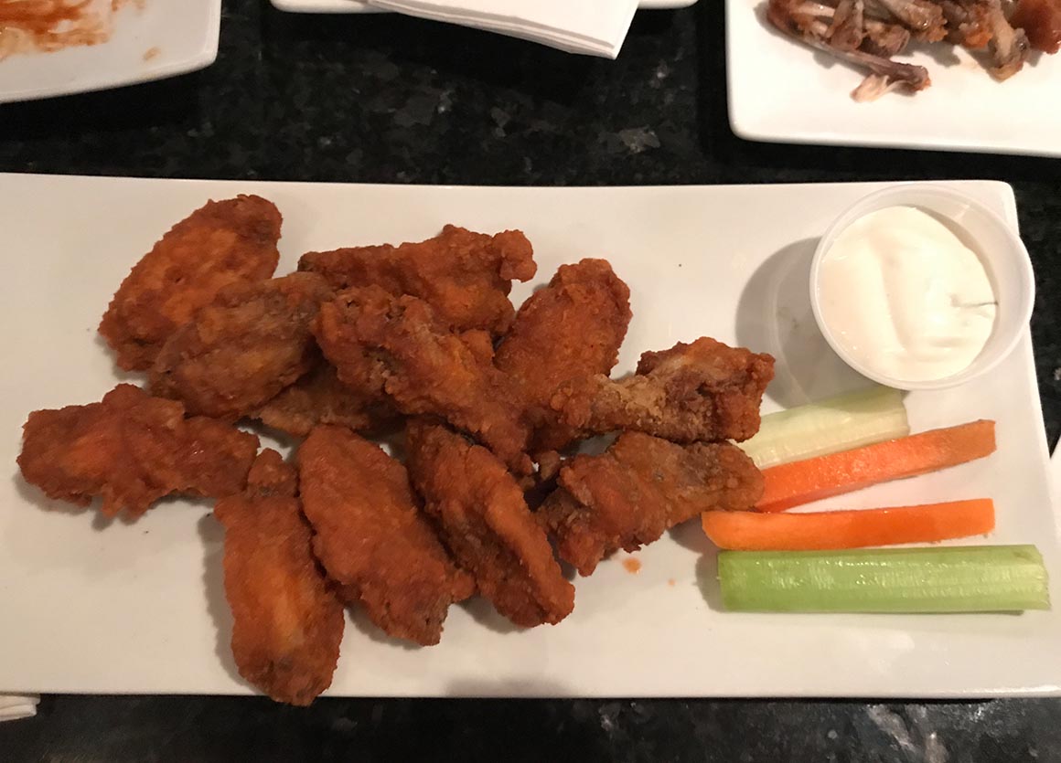 Aber natürlich steht nicht nur das Bier im Mittelpunkt – wir sind ja schließlich nicht nur zum Trinken hier! Also bestellen wir jeweils ein Dutzend Chicken Wings, einmal mit Buffalo- und einmal mit BBQ-Soße.