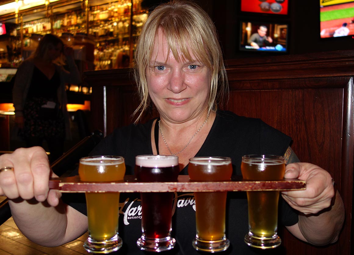 Johnny B. trumpft mit über 250 verschiedenen Biersorten direkt vom Fass auf – ein wahres Schlaraffenland für mich! 🍻 Unsere Kellnerin entpuppt sich als echte Bierliebhaberin und behauptet tatsächlich, alle Sorten schon probiert zu haben (hoffentlich nicht an einem einzigen Tag!). Ich wage mich an einen „Flyer“ heran, das sind vier verschiedene Biersorten in kleinen Gläsern. Ich gebe unserer sympathischen Bedienung eine grobe Vorstellung davon, was ich mag, und überlasse ihr die Qual der Wahl.