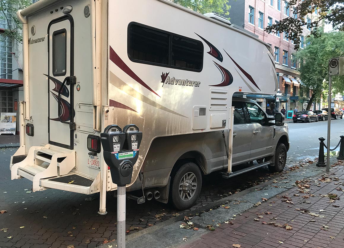 Wir nehmen die Homer Street, um wieder zurück nach Gastown und zu unserem Camper zu gelangen. An der Ecke erreichen wir die Water Street genau dort, wo die berühmte Steam Clock steht. Ein lustiger Anblick, wie unser Camper mitten in der Stadt steht und den Touristen die Sicht versperrt. Aber hey, wir haben einen echt günstigen Parkplatz ergattert!