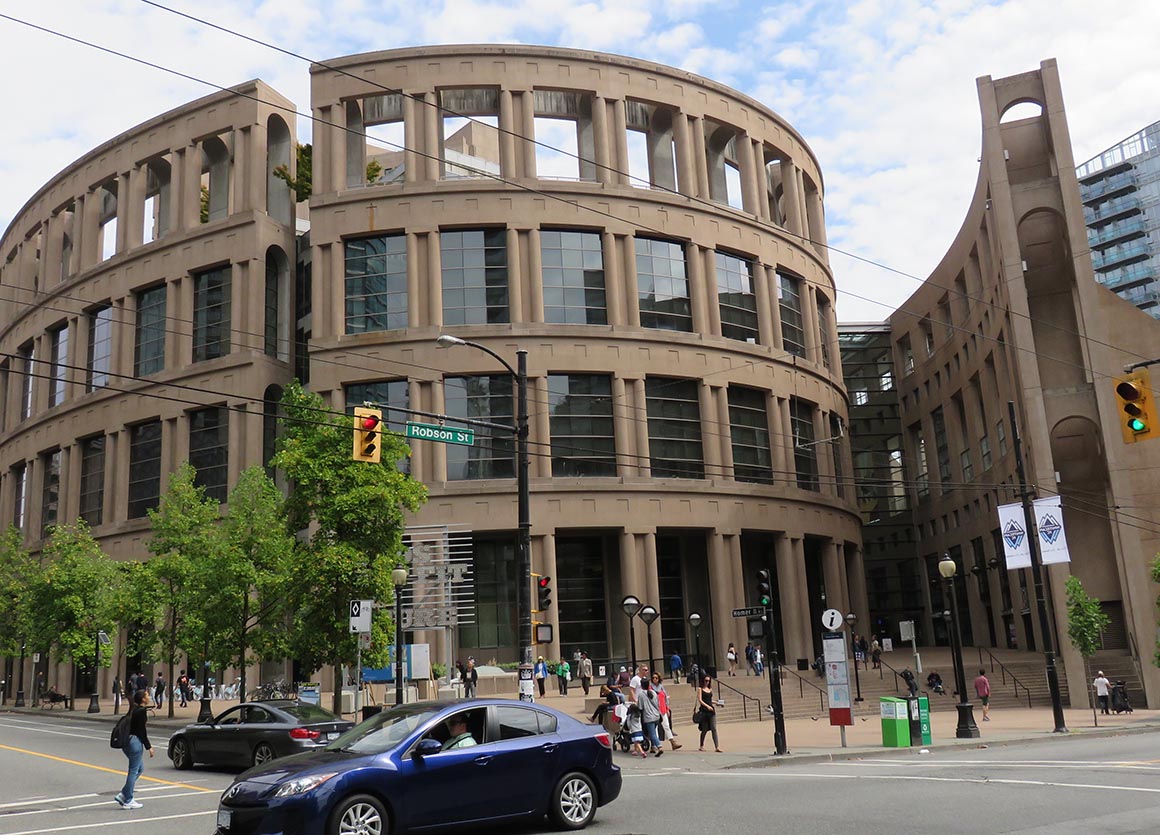 Zuerst erkunden wir die Water Street mit ihren zahlreichen Souvenir-Shops und biegen dann in Richtung Robson Street ab. Die Robson Street gilt als die Haupteinkaufsstraße in Vancouver, gesäumt von exklusiven Modeboutiquen, Geschäften und Restaurants. Hier befindet sich auch die Vancouver Public Library, deren Form an das Kolosseum in Rom erinnert.