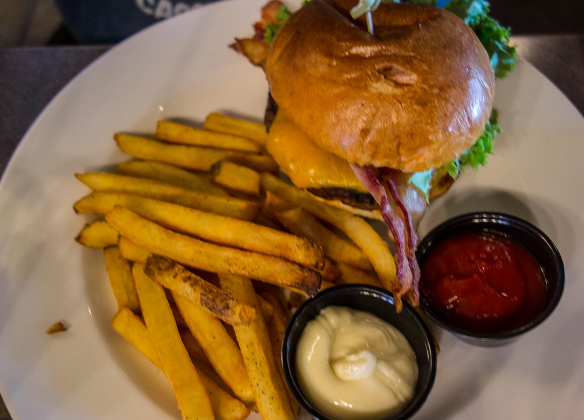 Um 17:30 Uhr stehen wir in dem großzügigen Lokal, nur um festzustellen: Wir sind die einzigen Gäste. Offenbar ist das hier keine klassische Dinner-Zeit. Egal – der Hunger ist da, und das Essen ist ausgezeichnet. Stefan entscheidet sich für einen Classic Burger, ich nehme den Spiced Chicken Wrap. Die Portionen sind reichlich, der Geschmack top, und nur die Preise lassen uns schmunzeln. Billig ist anders, aber hey – in der echten Schweiz hätten wir für das gleiche Menü wohl einen Kleinwagen verkaufen müssen.