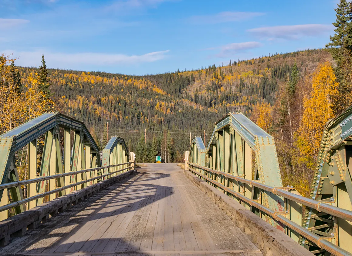 Die letzten Kilometer vor der Brücke am Klondike Highway fühlen sich wie ein sanftes Ausrollen an. Die Landschaft weitet sich, die Farben werden noch einmal kräftiger, und die Sonne spielt ein letztes Mal mit den Konturen der Berge. Punkt 10:00 Uhr rollen wir über die Brücke, die das Ende des Dempster markiert. Ein bisschen Wehmut schwingt mit – dieser Highway war ruppig, fordernd und gnadenlos ehrlich, aber gleichzeitig so wunderschön, dass man ihn nicht vergisst.