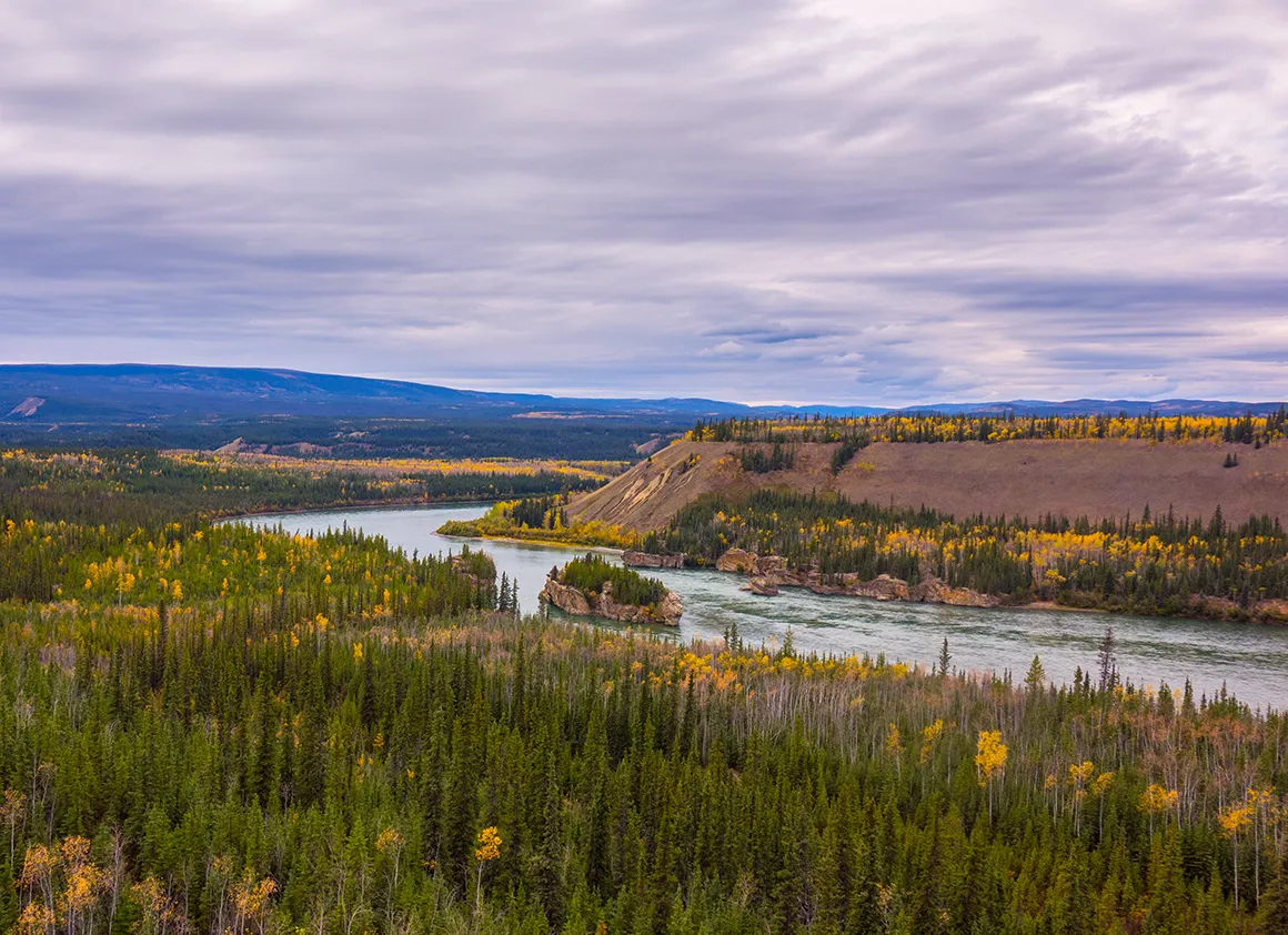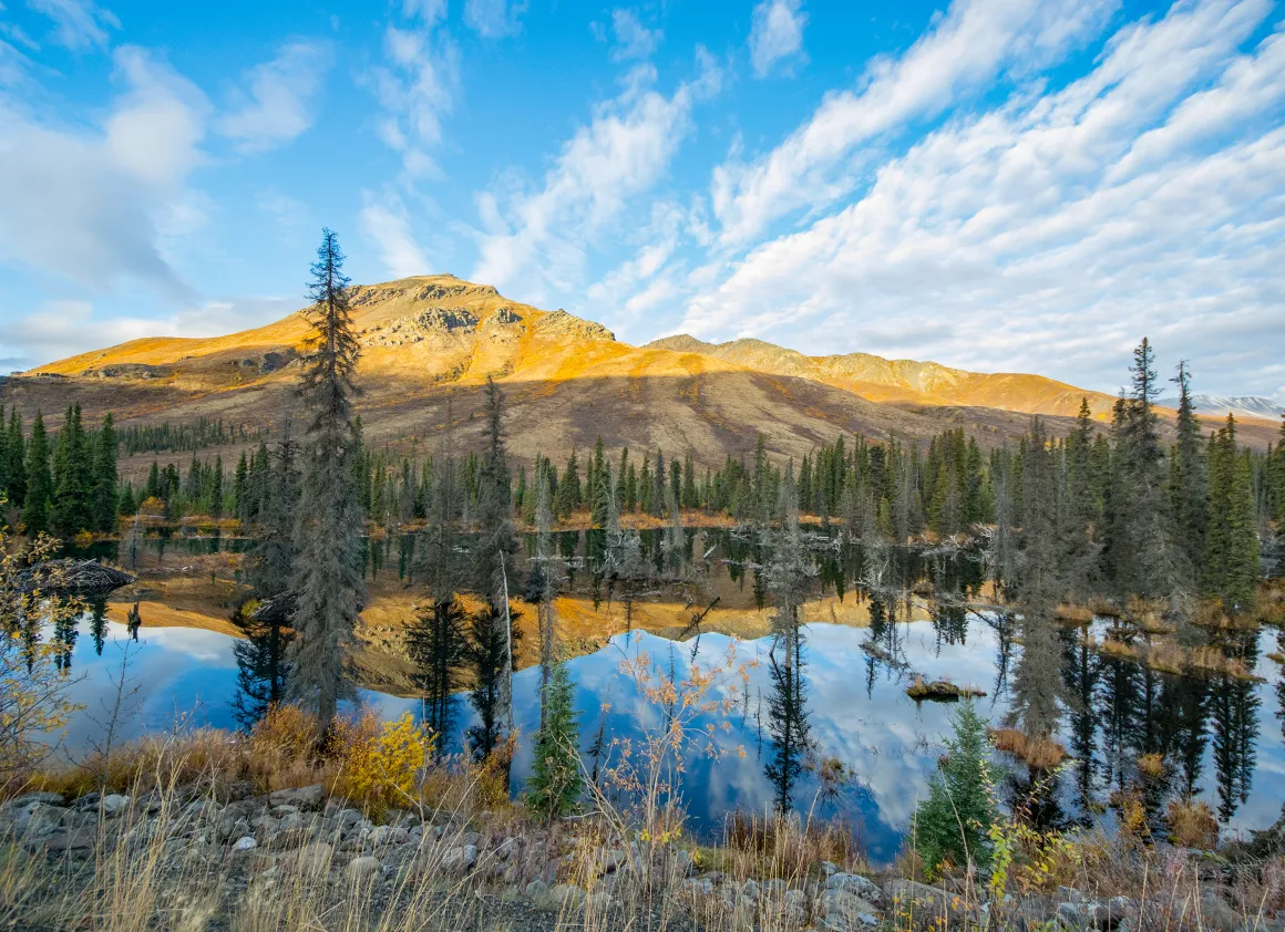 Unsere Fahrt vom Abzweig des Dempster Highways zurück nach Whitehorse war ein Fest für die Augen – strahlend blauer Himmel, knackige Herbstfarben und eine Landschaft, die selbst Postkarten neidisch machen würde. Schon kurz nach dem Start lockten uns die ersten Fotostopps, und wir geben uns der Versuchung nur allzu gerne hin. Gravel Lake spiegelt die goldgelben Bäume im klaren Wasser, und wir verbringen einige Zeit damit, einfach nur zu schauen und zu genießen.