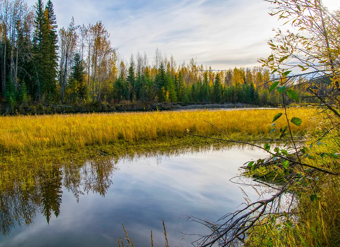 Kaum zehn Minuten sind wir zurück auf dem Klondike Highway, da lacht uns schon ein Schild verheißungsvoll entgegen – Scenic Viewpoint. Na klar, wir halten an. Schließlich haben wir ja noch nicht genug Fotos (Ironie aus). Ein kleiner Pfad führt uns durch hohes Schilfgras bis zum Klondike River.