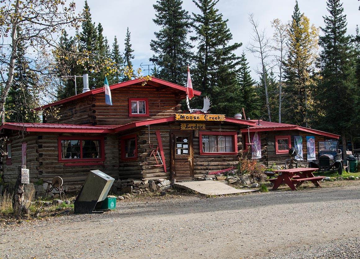 Widerwillig reißen wir uns los, denn der Highway ruft. Nach etwa anderthalb Stunden Fahrt taucht die Moose Creek Lodge am Straßenrand auf – oder besser gesagt: ihre verschlossene Eingangstür. Ein Schild verkündet trocken: „Closed for the Season“. Na toll. Wir hatten uns schon innerlich auf einen gemütlichen Lunch mit heißer Suppe und Kaffee eingestellt, und nun stehen wir vor leeren Veranda-Stühlen. Aber immerhin: wieder ein Grund, irgendwann zurückzukommen.