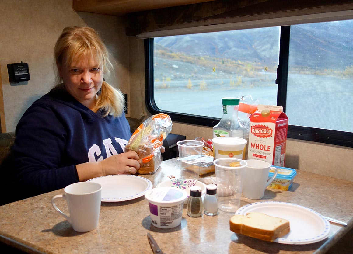 Beim Frühstück möchten wir uns nicht mit einer schnöden Aussicht auf den Parkplatz zufriedengeben. Nein, wenn schon, dann die volle Panoramakulisse! Also brechen wir auf und rollen zurück hinauf zum Tombstone Mountain Aussichtspunkt – unser altbekanntes Highlight von vor zwei Tagen. Schließlich schmeckt Toast mit Marmelade doppelt so gut, wenn man ihn mit Blick auf endlose Täler und Berge isst, die gerade in goldrotes Morgenlicht getaucht werden.