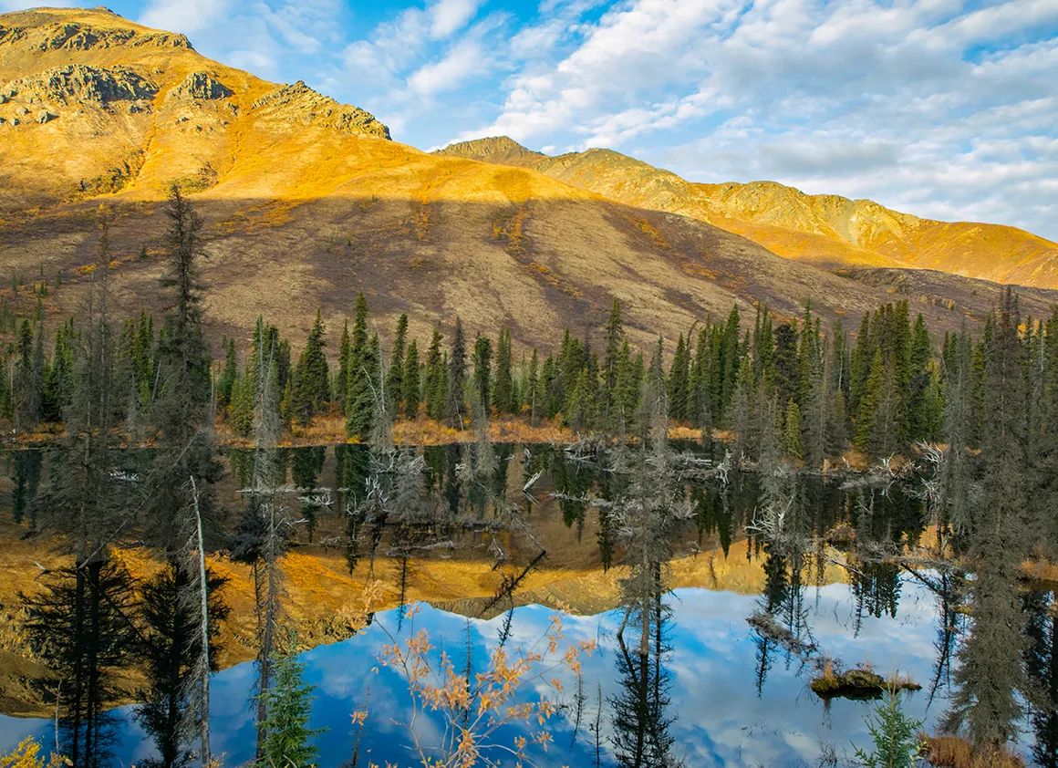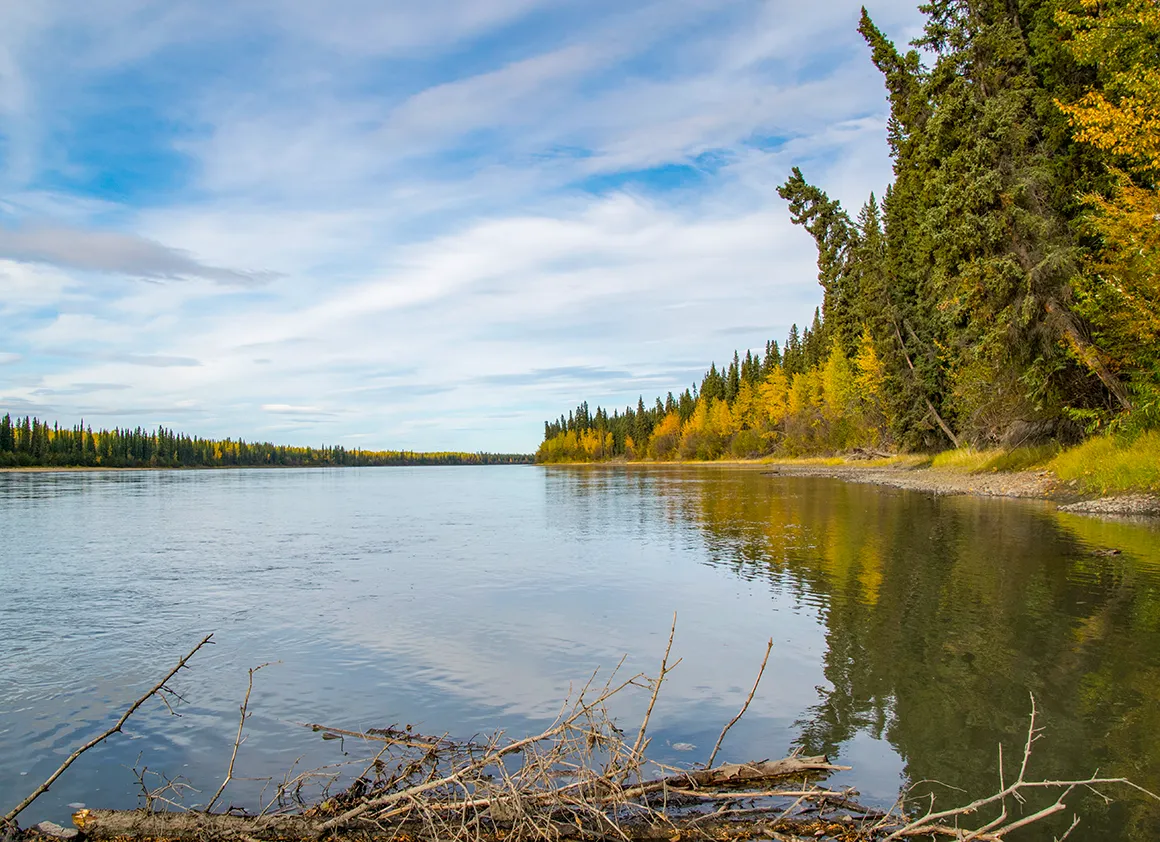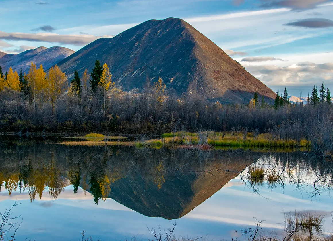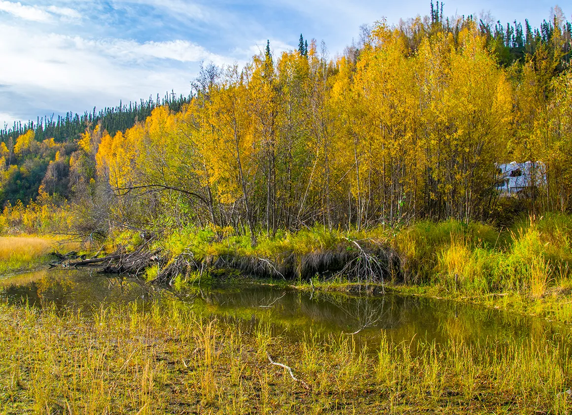Unsere Fahrt vom Abzweig des Dempster Highways zurück nach Whitehorse war ein Fest für die Augen – strahlend blauer Himmel, knackige Herbstfarben und eine Landschaft, die selbst Postkarten neidisch machen würde. Schon kurz nach dem Start lockten uns die ersten Fotostopps, und wir geben uns der Versuchung nur allzu gerne hin. Gravel Lake spiegelt die goldgelben Bäume im klaren Wasser, und wir verbringen einige Zeit damit, einfach nur zu schauen und zu genießen.