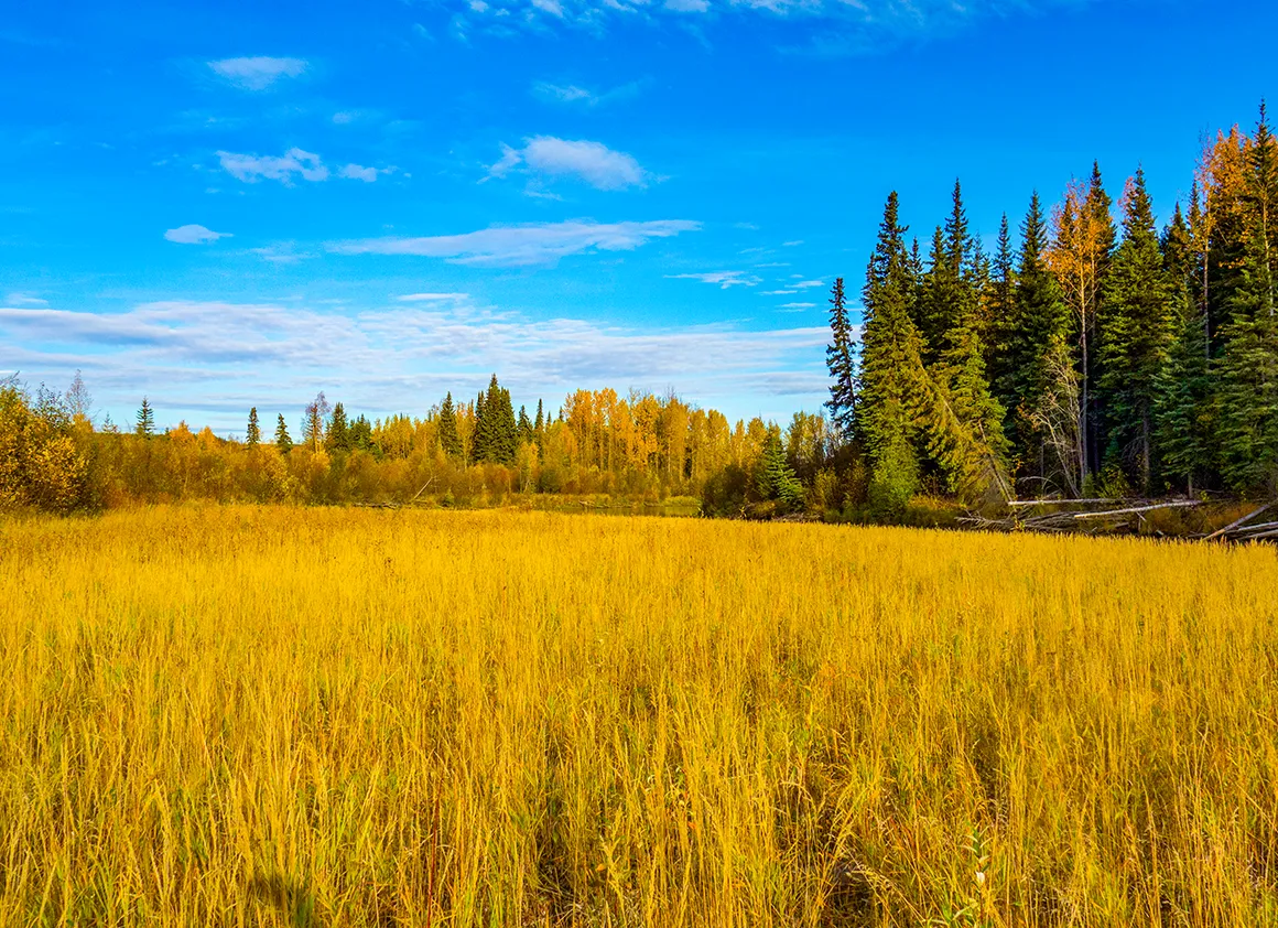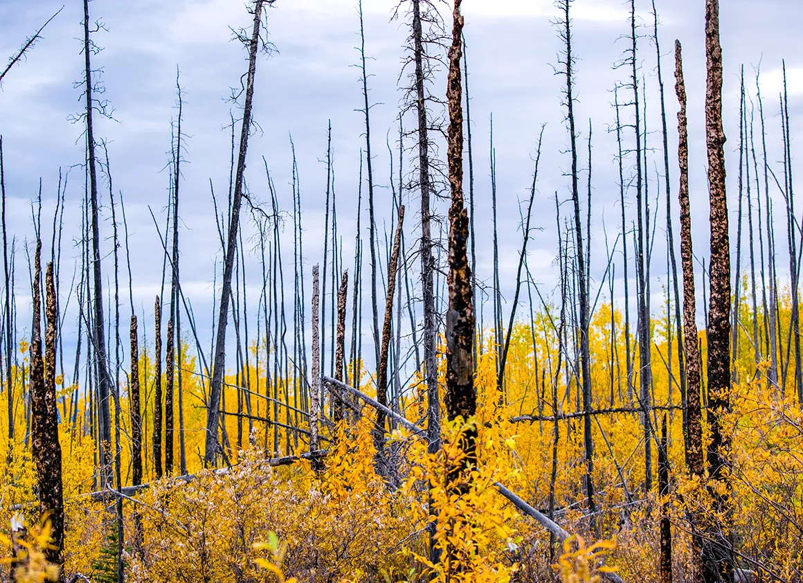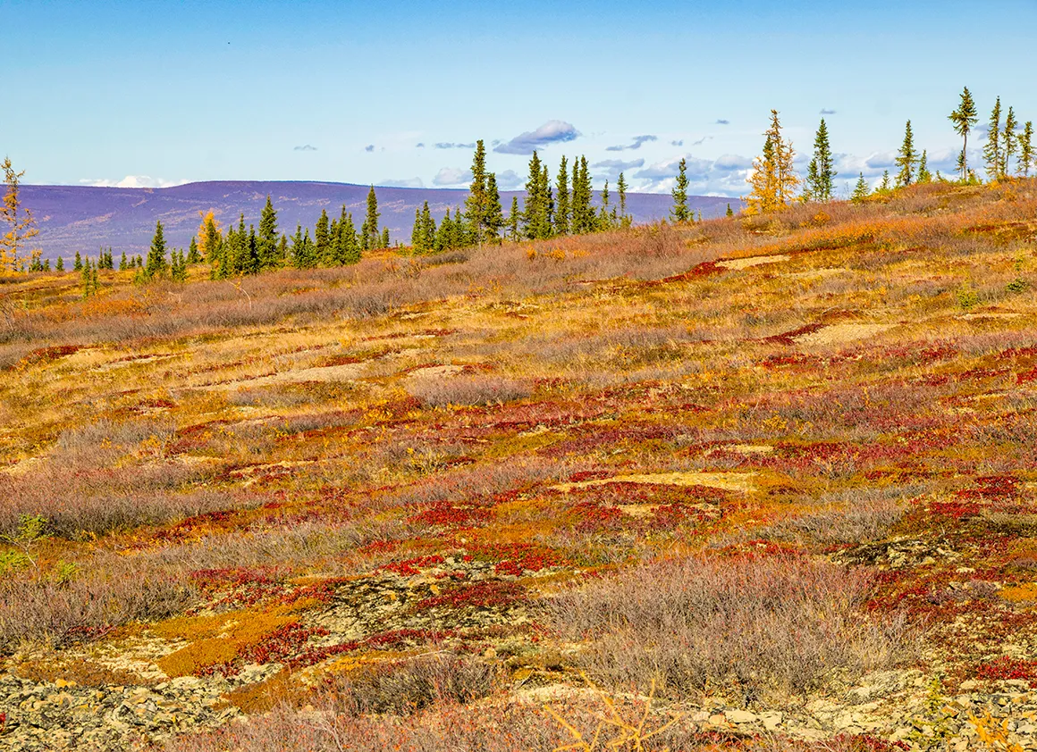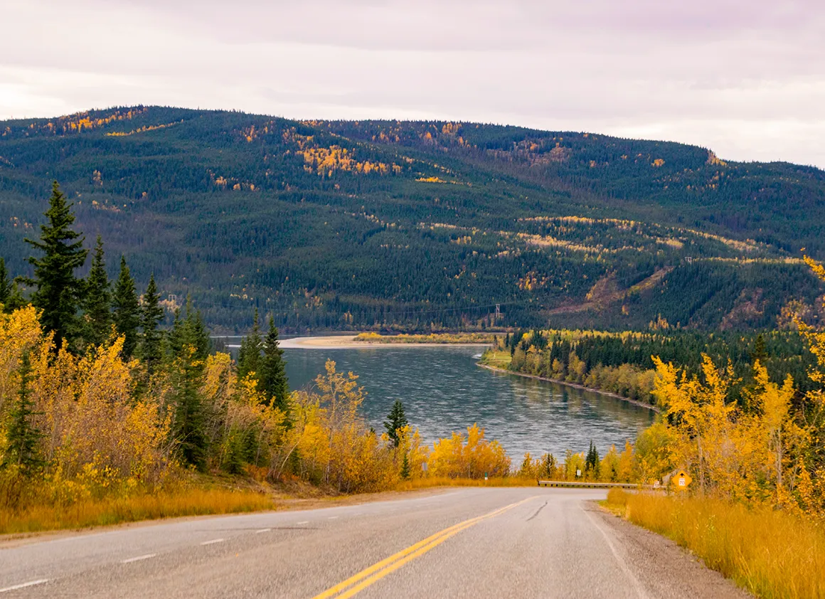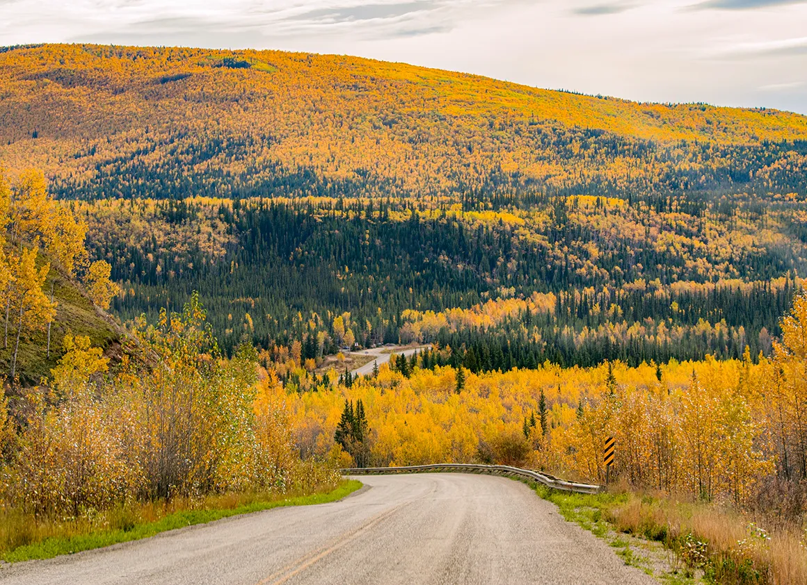 Nachdem wir Tombstone Mountain hinter uns gelassen haben, öffnet sich vor uns ein Naturkino in Überbreite. Die Straße zieht sich wie ein hellgraues Band durch eine Landschaft, die aussieht, als hätte jemand alle Herbstfarben gleichzeitig in den Mixer geworfen und dann großzügig über die Hügel verteilt. Goldgelb, sattrot, tiefgrün – alles leuchtet im Sonnenlicht, als stünde die Natur kurz vor einer großen Premiere.