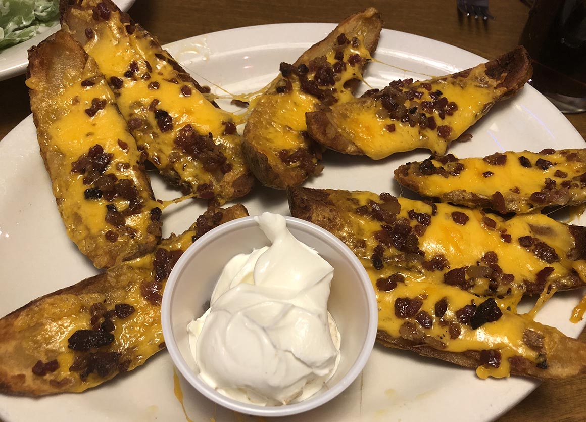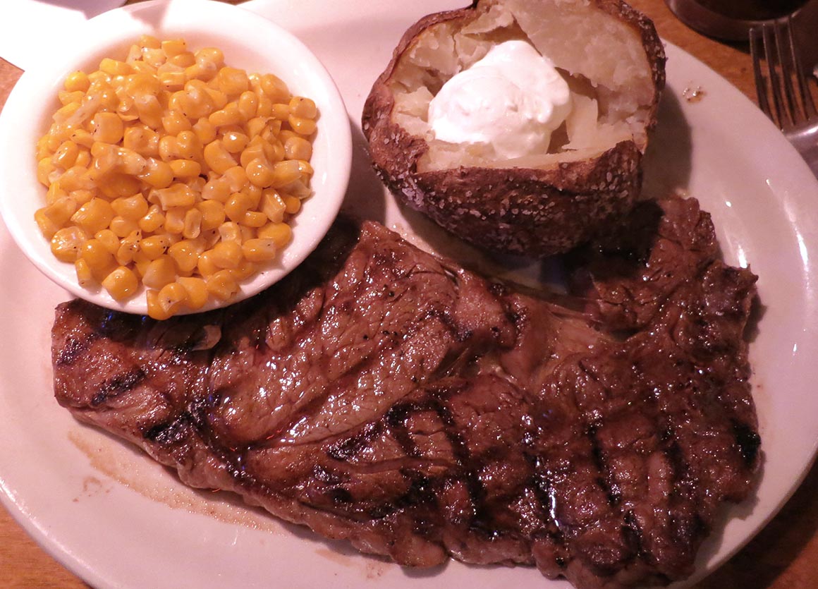 Aber heute bin ich vorbereitet, die Uhr ist richtig eingestellt, die Zeitverschiebung einkalkuliert – diesmal gibt’s Steak, und zwar pünktlich. Schon beim Betreten des Restaurants schlägt uns der Duft von gegrilltem Fleisch entgegen, Erdnussschalen knirschen unter den Schuhen, und die legendären Texas-Roadhouse-Brötchen mit Zimtbutter stehen bereit. Als Vorspeise gönnen wir uns Tater Skins, mit Käse und Speck überbackene Kartoffeln, so sündhaft lecker, dass man fast das Hauptgericht vergessen könnte – und dank Nadines Gutschein sind sie sogar kostenlos. Doch dann kommen die eigentlichen Stars des Abends: saftige Steaks, perfekt gegrillt, begleitet von knackigem Salat und einem eiskalten Getränk.