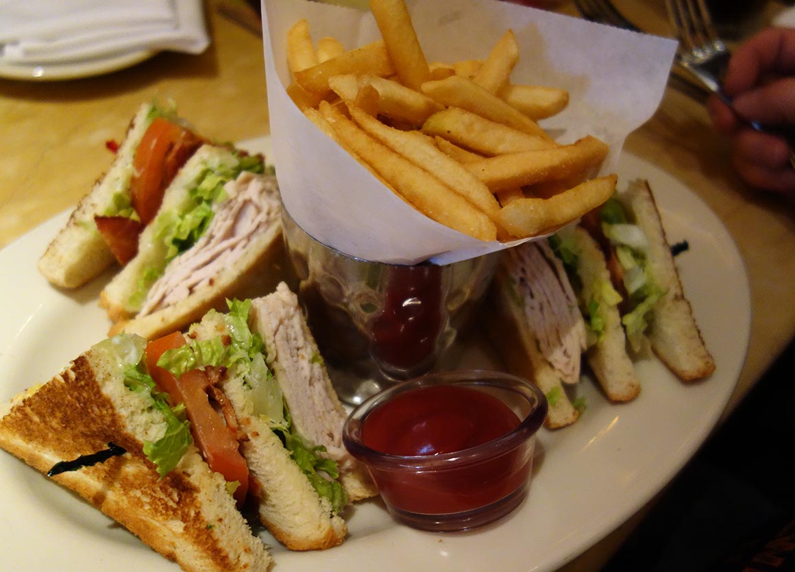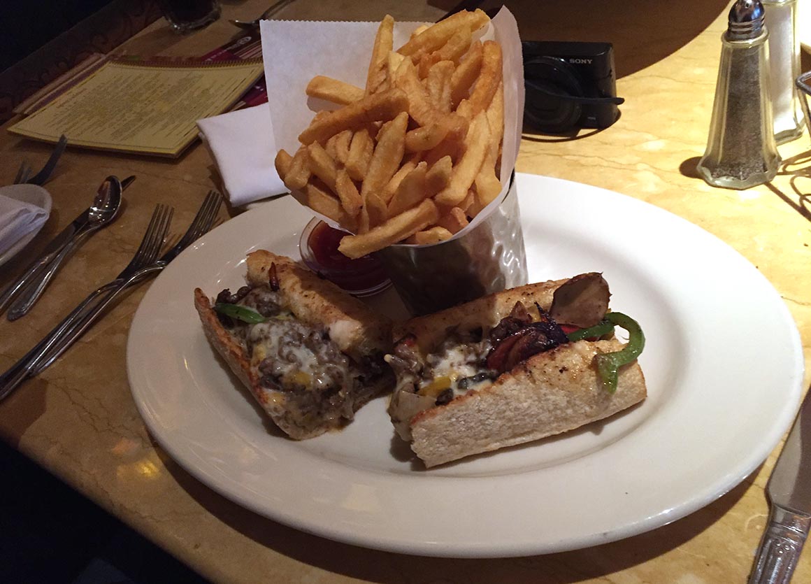 Die Cheesecake Factory ist für uns ein kulinarischer Mythos, dem wir bisher auf all unseren Reisen aus unerfindlichen Gründen immer ausgewichen sind. Heute ist der Tag der Wahrheit. Schon beim ersten Blick auf die Speisekarte wird klar: Dieses Restaurant ist nicht nur für Käsekuchen berühmt – es ist eine gastronomische Wundertüte! California Cheesesteak, Meatloaf, Chicken-Avocado-Sandwich, Club Sandwich – eine Auswahl, die selbst ein kleines Buch füllen könnte. Portionen? Gigantisch. Preise? Nicht gerade günstig. Geschmack? Absolut genial.