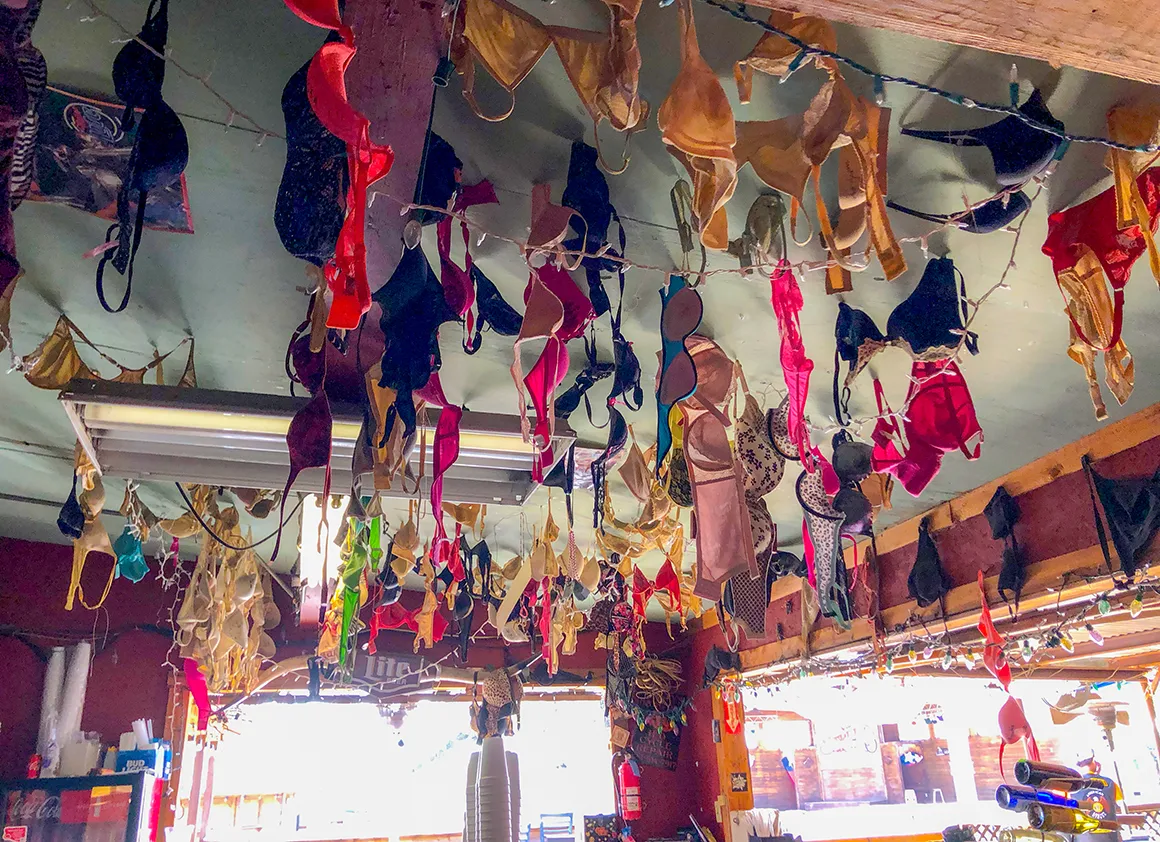 Bandera wäre natürlich nicht komplett ohne einen Besuch in einem echten Saloon. Wir betreten die 11th Street Cowboy Bar, einen der berühmtesten Saloons der Stadt. Ein Ort, der förmlich schreit: “Hier bist du im Wilden Westen!” Schon draußen gibt es das erste Highlight: Harley & Horses, prangt groß auf der Werbetafel. Und genau so ist es. Vor der Bar stehen tatsächlich Motorräder und Pferde friedlich nebeneinander geparkt, als ob das hier die normalste Parkordnung der Welt wäre. Willkommen in Texas’ Wildem Westen! Kaum treten wir ein, trifft uns die Atmosphäre wie ein Lassoschlag. Die Decke? Vollgehängt mit BHs in allen erdenklichen Farben und Formen. Neonpinke Spitzen-BHs baumeln neben schlichten weißen Bügel-BHs, und irgendwo dazwischen hängt ein Glitzer-Exemplar, das aussieht, als hätte es eine Discokugel verschluckt. Die “Dekoration” könnte glatt als Kunstinstallation durchgehen, aber hier ist es einfach Texanischer Humor in Reinform.