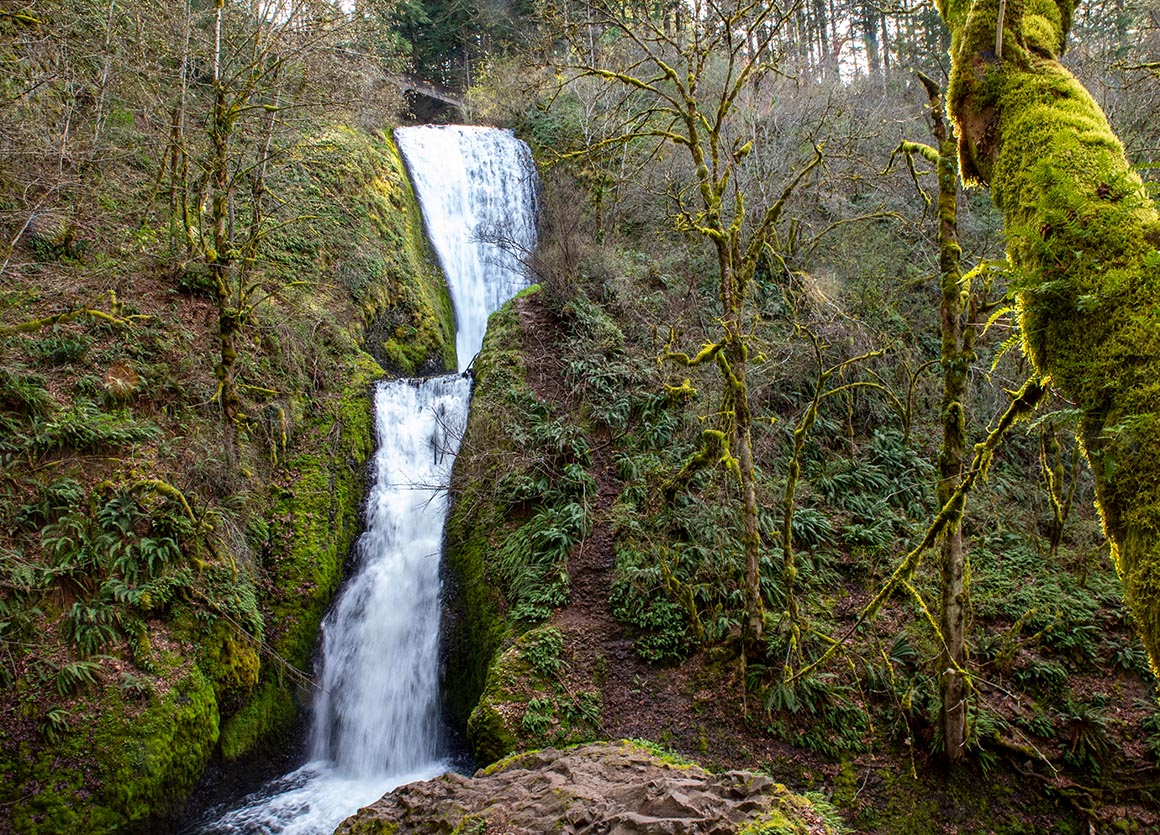 Natürlich müssen wir auch hier ein paar Fakten einstreuen –  denn dieser Wasserfall hat’s in sich . Der Bridal Veil Creek entspringt am  1.203 Meter hohen Larch Mountain , schraubt sich dann durch ein uraltes Tal und kippt sich ganz zum Schluss in zwei fulminanten Stufen ins Columbia River Basin. Die obere Kante:  30 Meter , die untere:  9 Meter , beide überzogen mit Moos, Basalt und einer Geschichte, die sich wohl kein Mensch mehr genau merken kann – aber  die Natur hat sie perfekt in Stein gemeißelt .