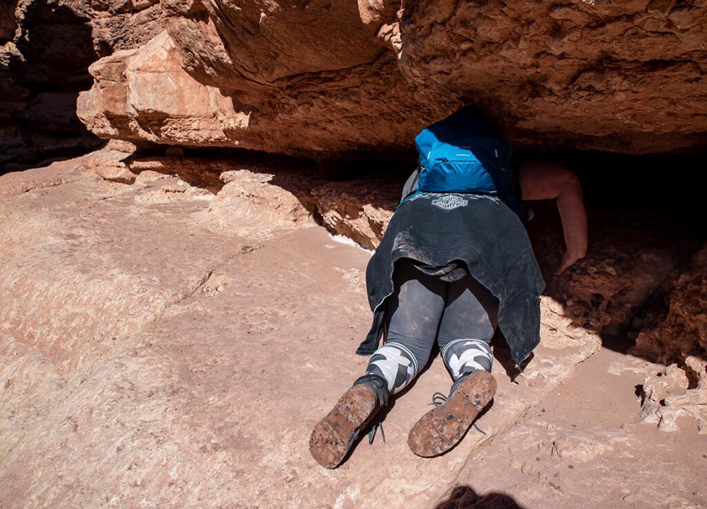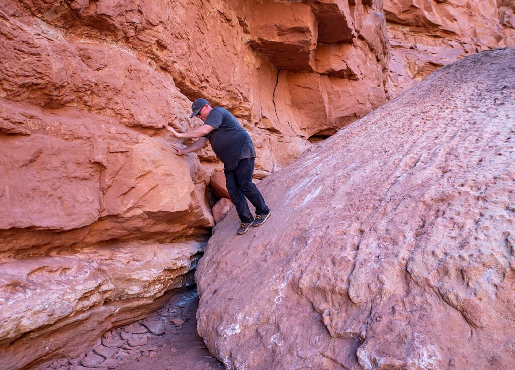 Der Einstieg in den nächsten Abschnitt des Cathedral Wash, und ganz ehrlich –  er sieht kein Stück weniger wild aus als damals. Ab hier wird’s sportlich. Und kreativ. Der Wash hat sich in ein Spielplatz-Labyrinth aus Felskuhlen, Tümpeln und Felsbrocken verwandelt. Wir laufen links, dann rechts, steigen rüber, krabbeln drunter. Jeder Meter ist so eine Mischung aus Hindernisparcours und „Findest-du-den-Weg?“-Rätsel.