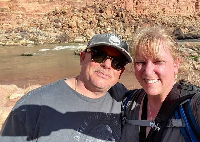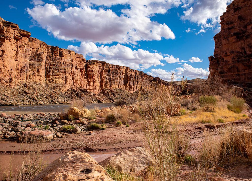 Der Trail wird zum Strategiespiel. Ein bisschen wie Tetris – nur dass man selbst das Tetristeil ist und möglichst nicht irgendwo steckenbleiben sollte. Und dann: Plötzlich, fast unerwartet, stehen wir am Ufer. Der Colorado. Breit, ruhig, kraftvoll. Eingebettet in rote Felswände, die aussehen, als hätte jemand die Sättigung zu hoch gedreht.