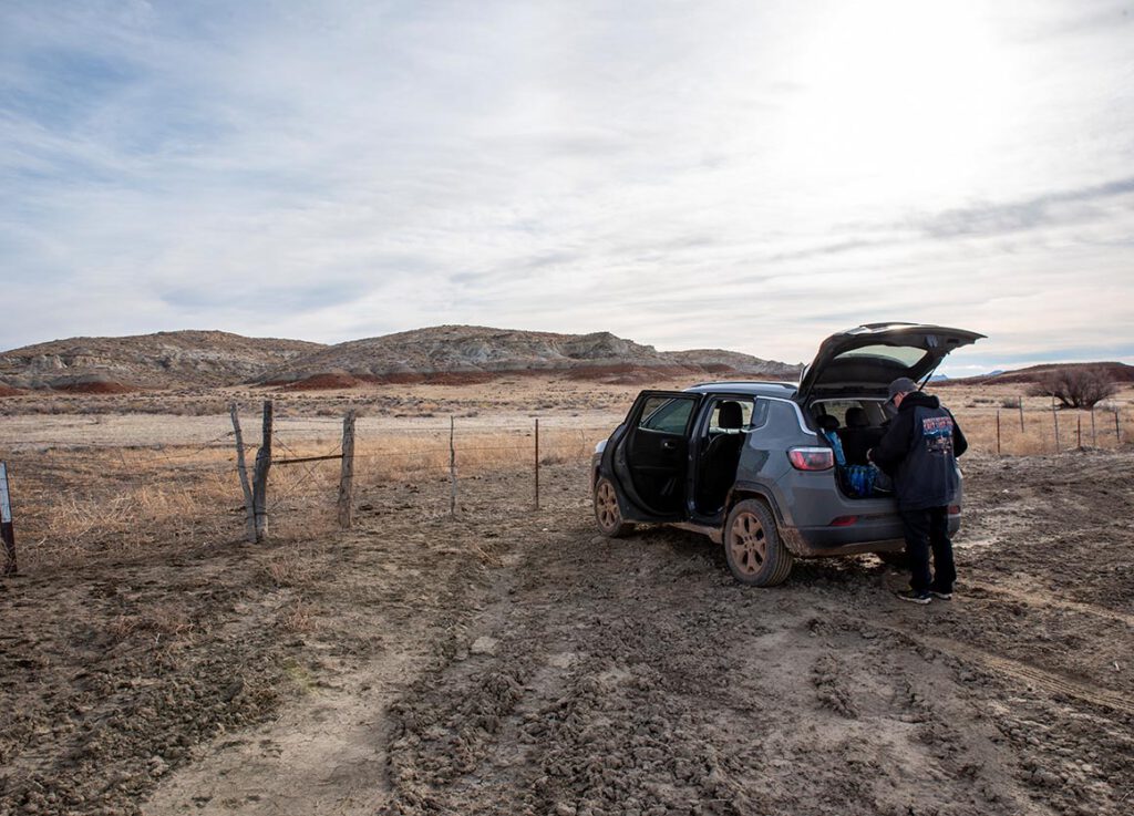 Aber hey – da ist ein Tor. Und dahinter?  Eine erstaunlich gute Schotterstraße. Nach dem Matschchaos gestern wirkt das hier wie  ein frisch gesaugter Teppich.  Wir nehmen die Einladung an, biegen bei der Gabelung rechts ab (K7065 – klingt wie ein Drucker, fährt sich aber gut) und tuckern  völlig unbehelligt durch eine karge, aber schöne Landschaft. Nach etwa einer halben Meile stehen wir plötzlich vor einem  eingezäunten Weidegebiet. Keine Schilder. Kein Trailhead. Kein Willkommen.  Nur: Zaun. Also parken wir das Auto einfach auf einem Feld. Ob das erlaubt ist? Keine Ahnung. Aber unser Jeep sieht dank gestern immer noch aus wie ein rollender Lehmbrocken, also fällt er  nicht weiter auf.   Camouflage durch Dreck – man nimmt, was man kriegt.