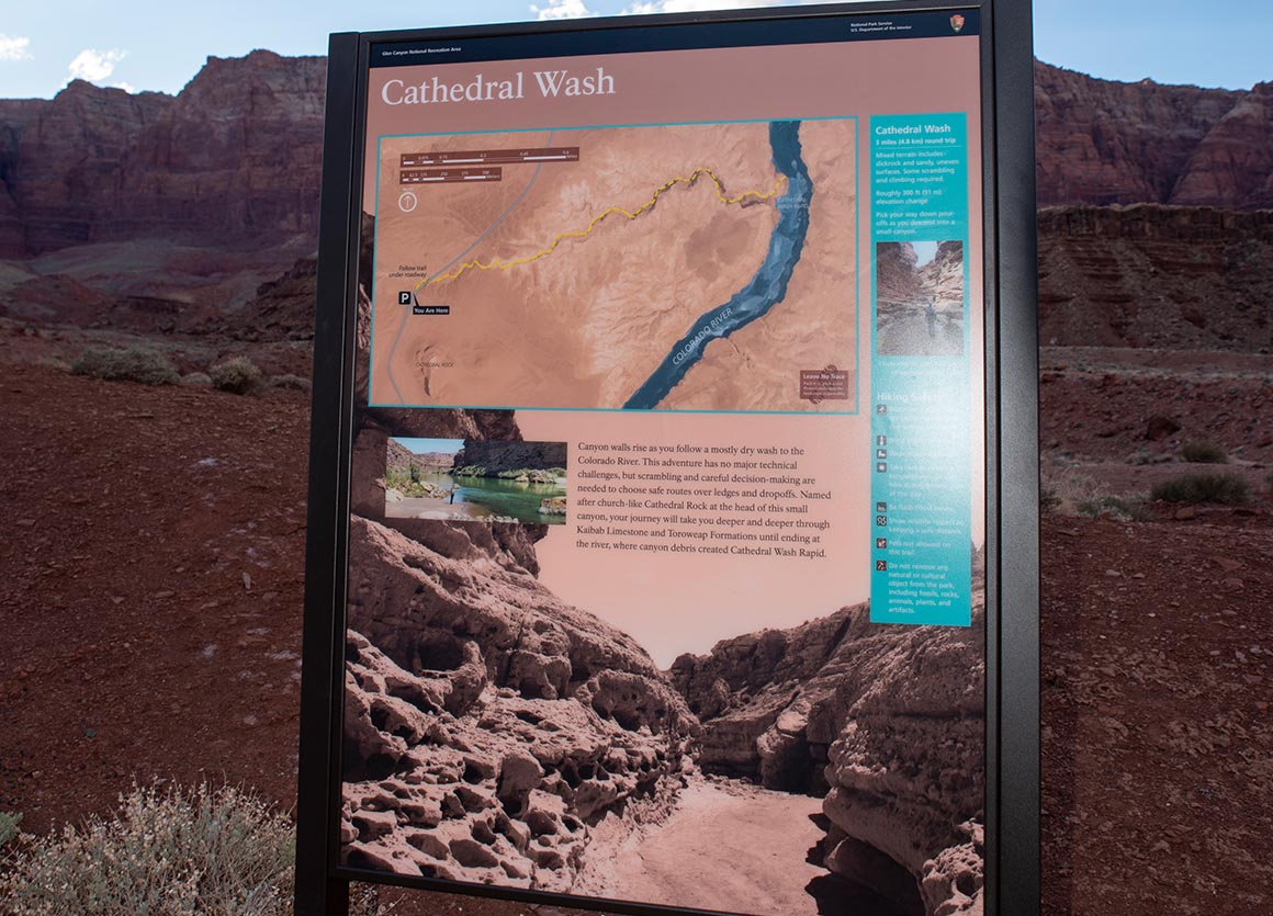 Beim letzten Bissen entsteht der Plan: Cathedral Wash Trail. Schon länger auf der Liste – und jetzt liegt er  in perfekter Halbtagesdistanz. Klingt ideal:  Canyon runter zum Colorado River, ein bisschen kraxeln, ein bisschen staunen,  und rechtzeitig zurück, bevor das Abendlicht zur Taschenlampe ruft. Von Page sind es rund 60 Minuten bis zum Trailhead – also genau die richtige Zeit, um das Essen zu verdauen, ohne einzuschlafen. Und mal ehrlich:  Nach dem Rainbow Valley kann heute eh nichts mehr schiefgehen.