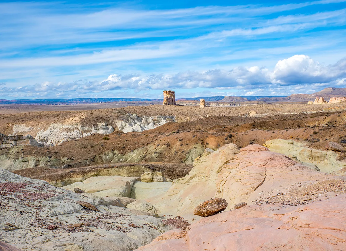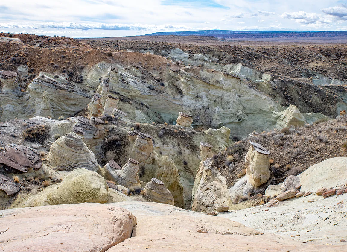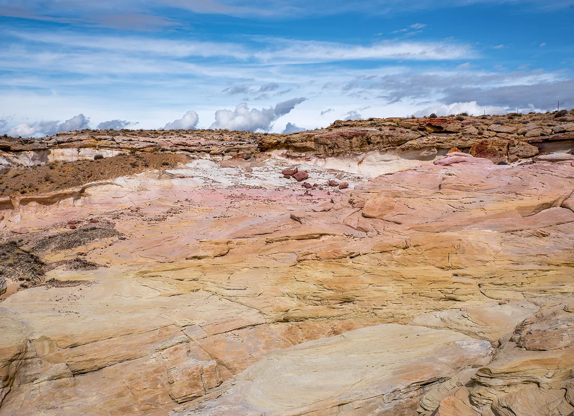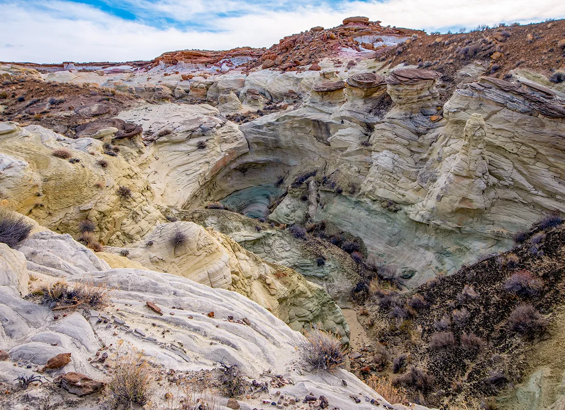 Als wir die Abbruchkante erreichen, bleibt uns kurz die Spucke weg. Unter uns breitet sich ein Kessel aus,  der aussieht wie ein Pastell-Tuschkasten auf LSD.  Zarte Töne von Rosa über Vanillegelb bis Cremeweiß –  alles so weich, dass man fast glaubt, es wäre gezeichnet und nicht echt. Wir stehen einfach nur da. Und staunen.