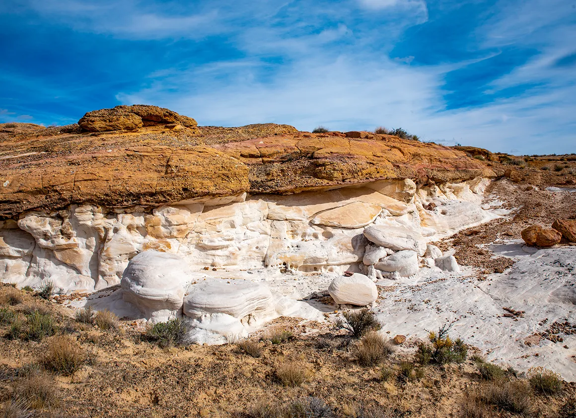 Plötzlich piept  Stefans GPS  und schlägt eine neue Richtung vor:  rechts ab – querfeldein. Na super.  Der Trail war eh langweilig. Also rein ins Dickicht. Der Boden wird sandiger , die Büsche kratziger,  unsere Orientierung eher gefühlt als GPS-genau.  Aber – wir sind unterwegs. Nach etwa 20 Minuten Marsch  zeigt sich plötzlich  am Horizont eine strahlend weiße Abbruchkante. Wir beschleunigen automatisch. Die Neugier ist geweckt. Was dahinter wohl auf uns wartet?