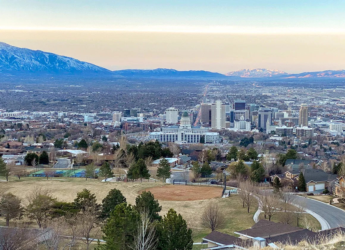 Der Weg zur Aussichtsplattform?  Kurz, angenehm, kein Drama.  Kein Husten, kein Keuchen, kein „Ich warte hier, geh du schon mal“. Stattdessen ein sanfter Anstieg, fast wie ein höflicher Spaziergang zum schönsten Fotospot der Stadt.  Und das Beste: Nach nur wenigen Minuten sind wir oben – und werden belohnt. Vor uns breitet sich  Salt Lake City  aus –  wie eine aufgeschlagene Schatzkarte aus Licht und Struktur. Die Sonne steht noch tief und wirft ihr goldenes Licht auf Dächer, Straßen und Parks, während die  Wasatch Mountains im Hintergrund fast filmreif den Rahmen bilden.  Die Skyline wirkt wie aus einem Architektur-Modell gegossen – nur eben in echt.