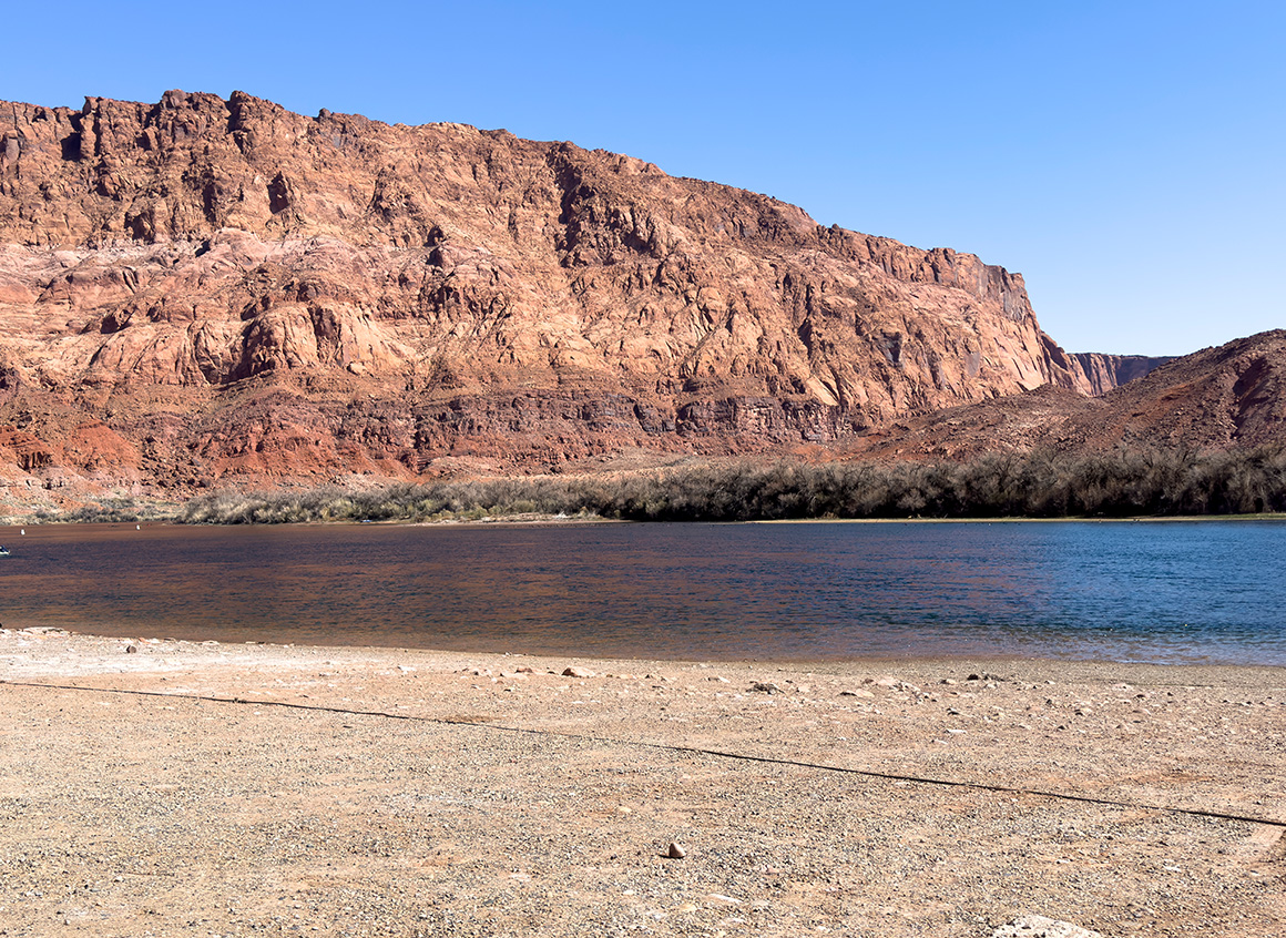 Als wir wieder bei unserem Auto ankamen, war klar: Der Tag war noch nicht vorbei. Der Colorado River hatte uns den direkten Zugang im Cathedral Wash verwehrt, also würden wir ihn eben auf andere Weise erreichen. Die Lees Ferry Road rief. Wir ließen den Canyon hinter uns und folgten der schmalen Straße, die sich wie eine endlose, asphaltierte Schlangedurch die steinige Landschaft zog. Ringsum rote Felswände, dramatische Steilhänge, bizarre Gesteinsformationen – ein Panorama wie aus einem Westernfilm. Und dann, irgendwann zwischen zwei sanften Kurven, blitzte in der Ferne etwas auf. Der Colorado River.