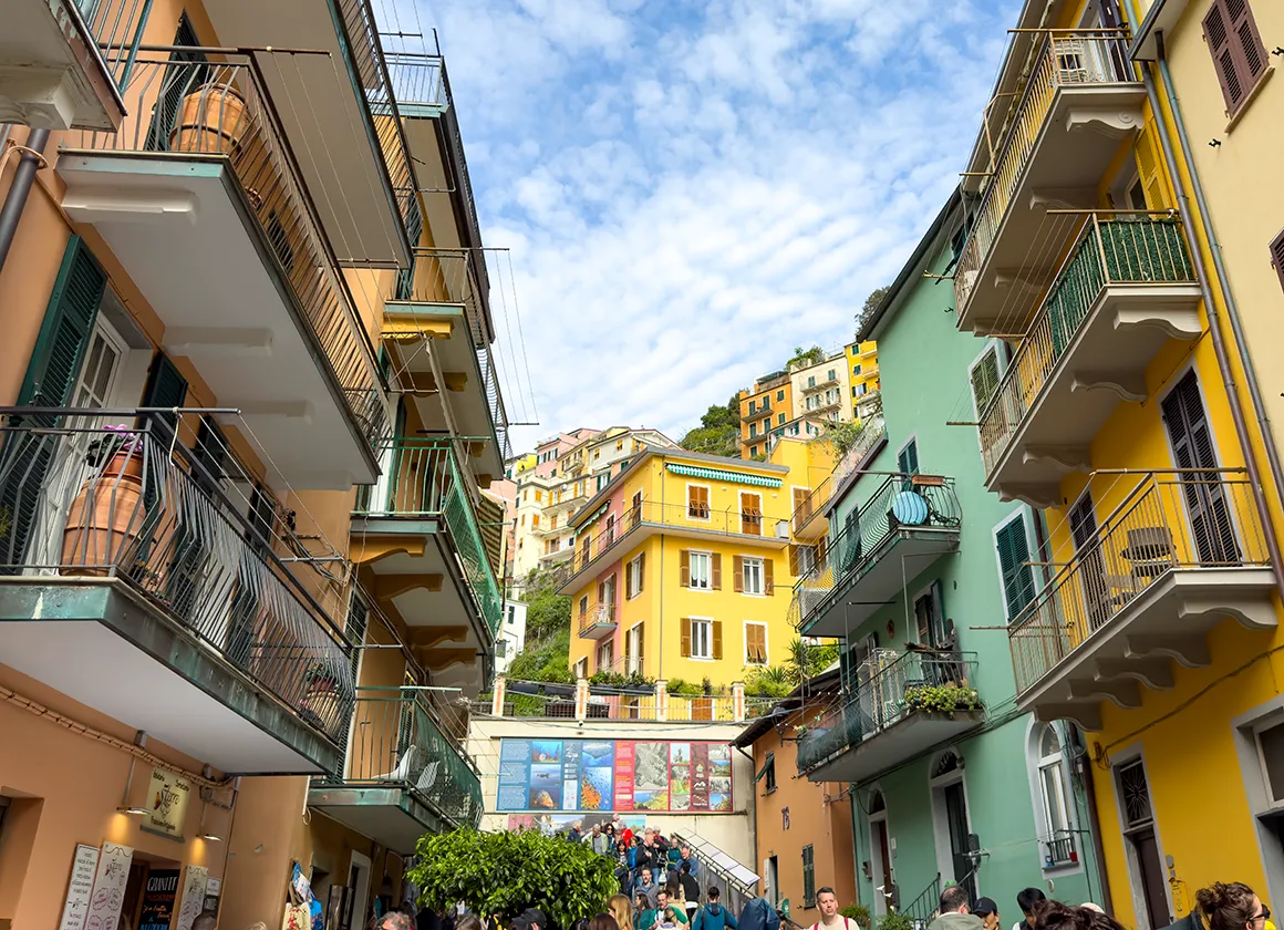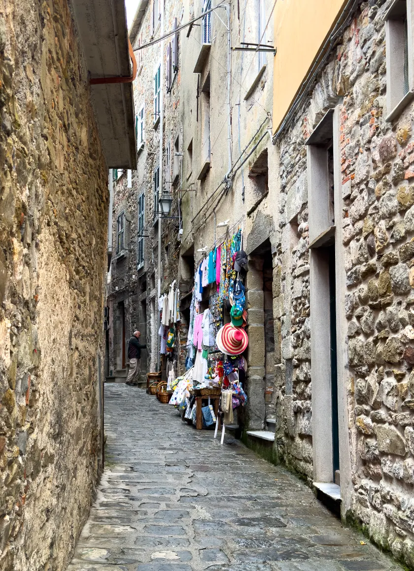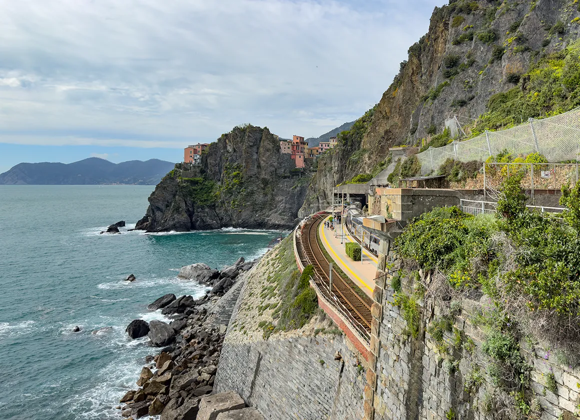 Der Weg vom Bahnhof hinein ins Dorf führt uns wie durch eine Postkartenkulisse. Enge Gassen, gelb-rosa Häuser mit grün schimmernden Fensterläden, Weinstöcke an den Hängen, Katzen auf Fensterbänken, Wäsche über den Köpfen – und das Meer, das irgendwo zwischen den Häuserschluchten aufblitzt, als wolle es sagen: „Da bin ich, bella.“