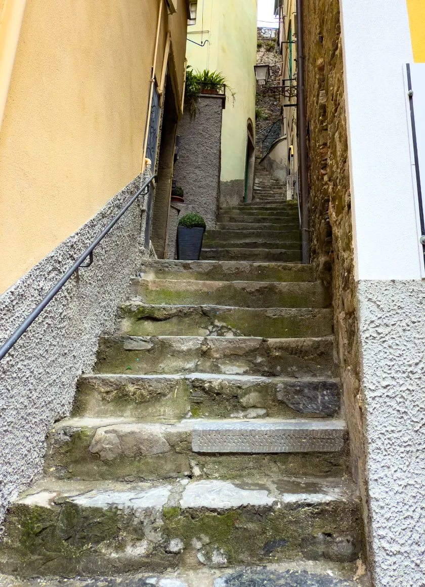 Durch schmale Gassen und über enge Steinstufen geht es wieder nach unten – der Rückweg wirkt plötzlich kürzer, die Beine leichter. Ob’s am Hunger liegt oder an der Aussicht auf eine echte italienische Mittagspause? Wahrscheinlich beides.