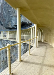 Wir sind genau richtig. Obwohl heute Ostermontag ist, ist es erstaunlich ruhig – Vorteil der Nebensaison. Und weil wir schon eine halbe Stunde vor unserer gebuchten Zeit am Einstieg sind, dürfen wir einfach losgehen. Kein Anstehen, kein Gedränge – nur wir, der Pfad, das Meer.