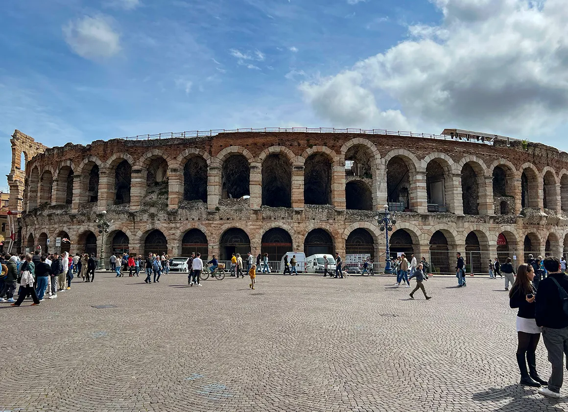 Dann erreichen wir sie: die Arena di Verona. Dieses eindrucksvolle römische Amphitheater, das wirkt, als hätte sich das Kolosseum einen kleinen, kultivierten Bruder zugelegt, der sich besser benimmt, gepflegter kleidet und am Abend lieber eine Arie singt, statt mit dem Schwert zu fuchteln. Über 2.000 Jahre alt – Steine, Säulen, Bögen – alles original. Man spürt fast noch die alten Römer mit Sandalen und ernstem Gesichtsausdruck, die hier Platz nahmen, um sich die Zeit mit Löwen, Wagenrennen oder anderen Events der etwas ruppigeren Art zu vertreiben.