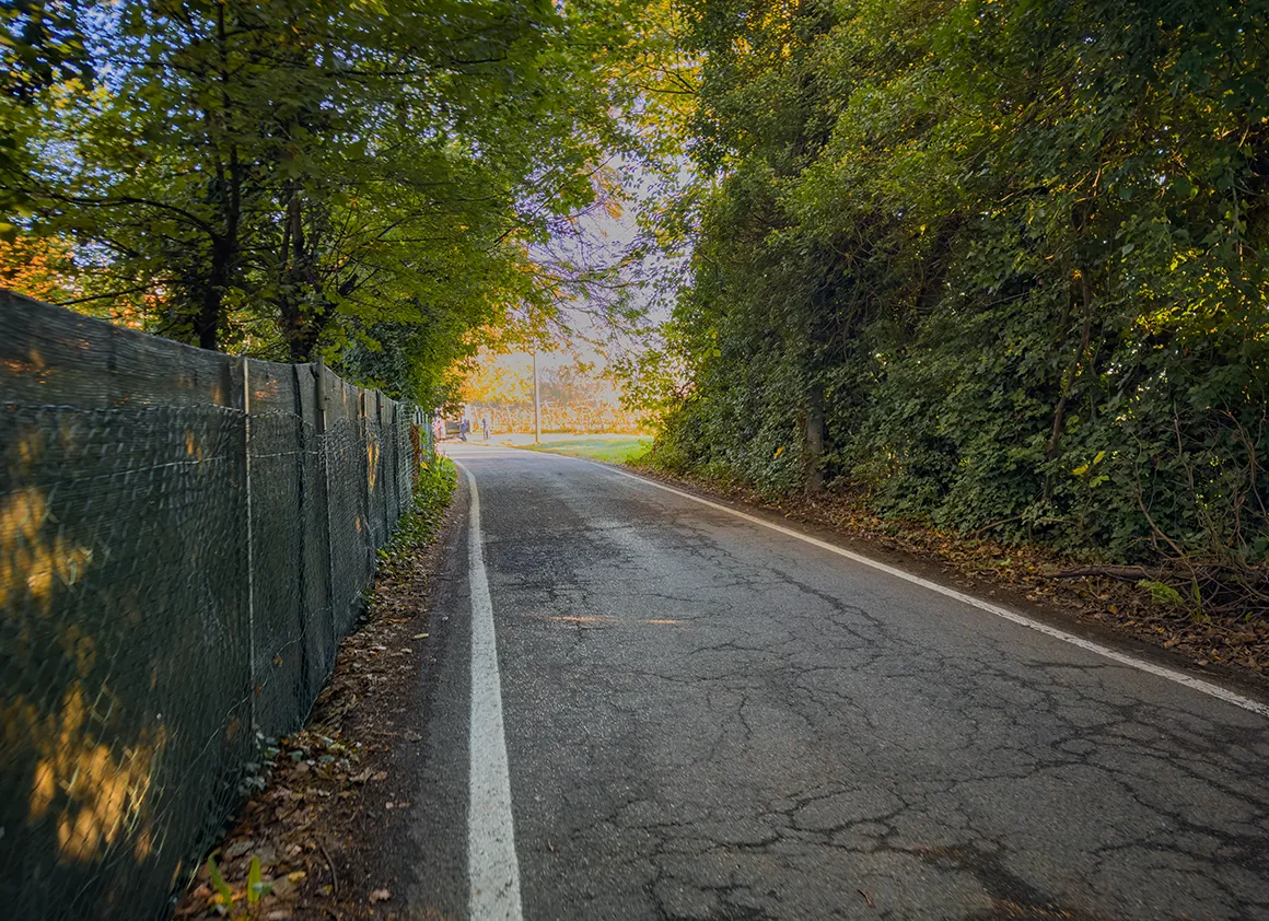 Also wanderten wir los, rechts Wald, links Maschendrahtzaun, zwischendurch ein bisschen Straßenbröckelei, aber viel Ruhe und Vogelgezwitscher. Italienischer Asphalt in seiner charmantesten Form.