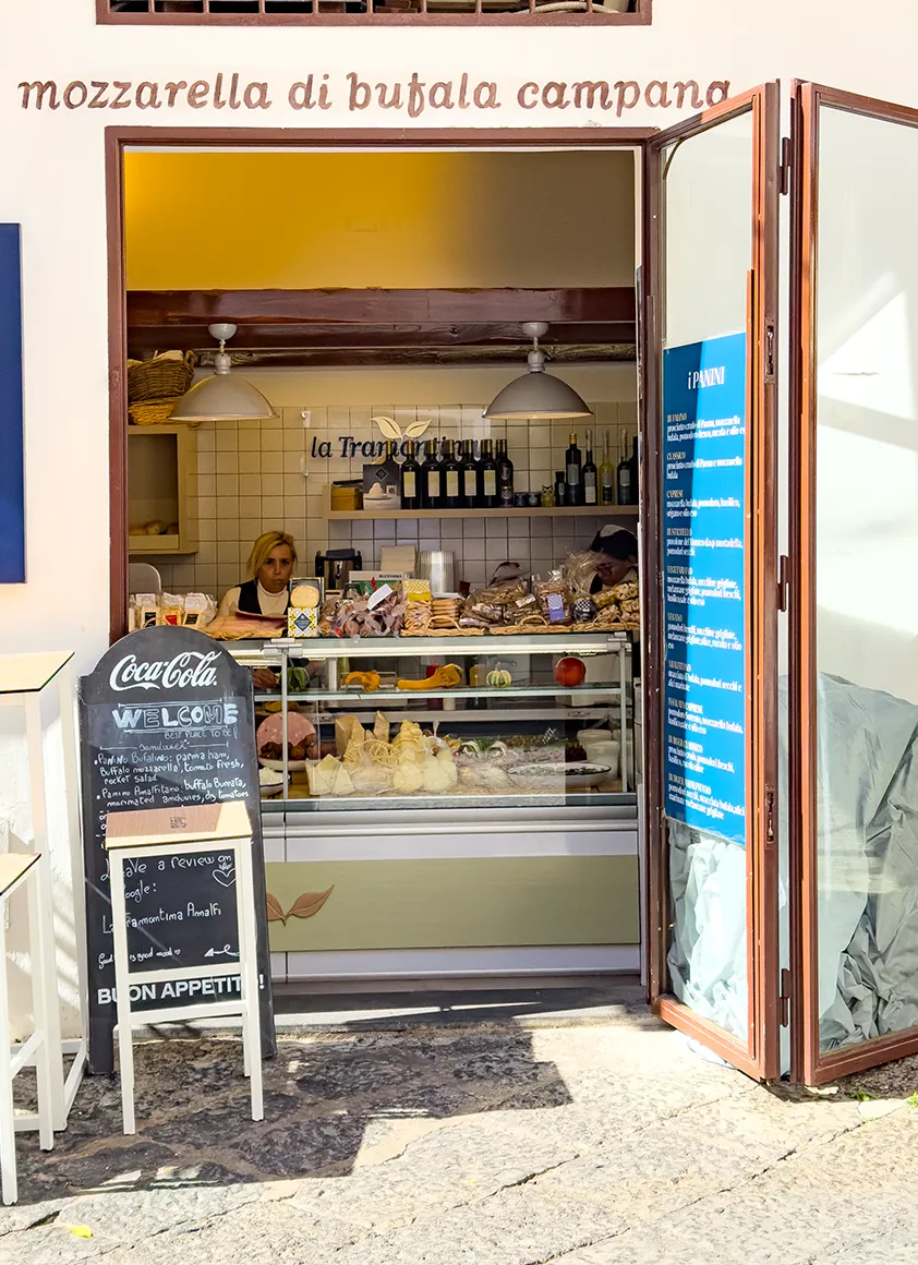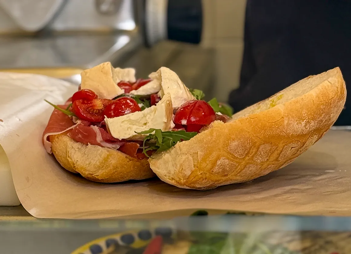 Kaum betreten wir die Piazza dei Dogi, läuft vor uns eine Gruppe Menschen mit… Moment… sind das Sandwiches oder kleine Backwaren-Weltenwunder? Riesige, duftende Panini, überquellend vor Mozzarella di Bufala, sonnenverwöhnten Tomaten und hauchdünnem Prosciutto – als hätten sie in einem italienischen Food-Werbespot mitgespielt. Unsere Spürnase folgt der Duftspur wie ein Bluthund – und landet zielsicher bei La Tramontina Amalfi. Ein unscheinbares Lädchen mit zwei Lampen über der Theke und einer Auswahl an frischen Zutaten, die einem das Wasser im Mund zusammenlaufen lässt.