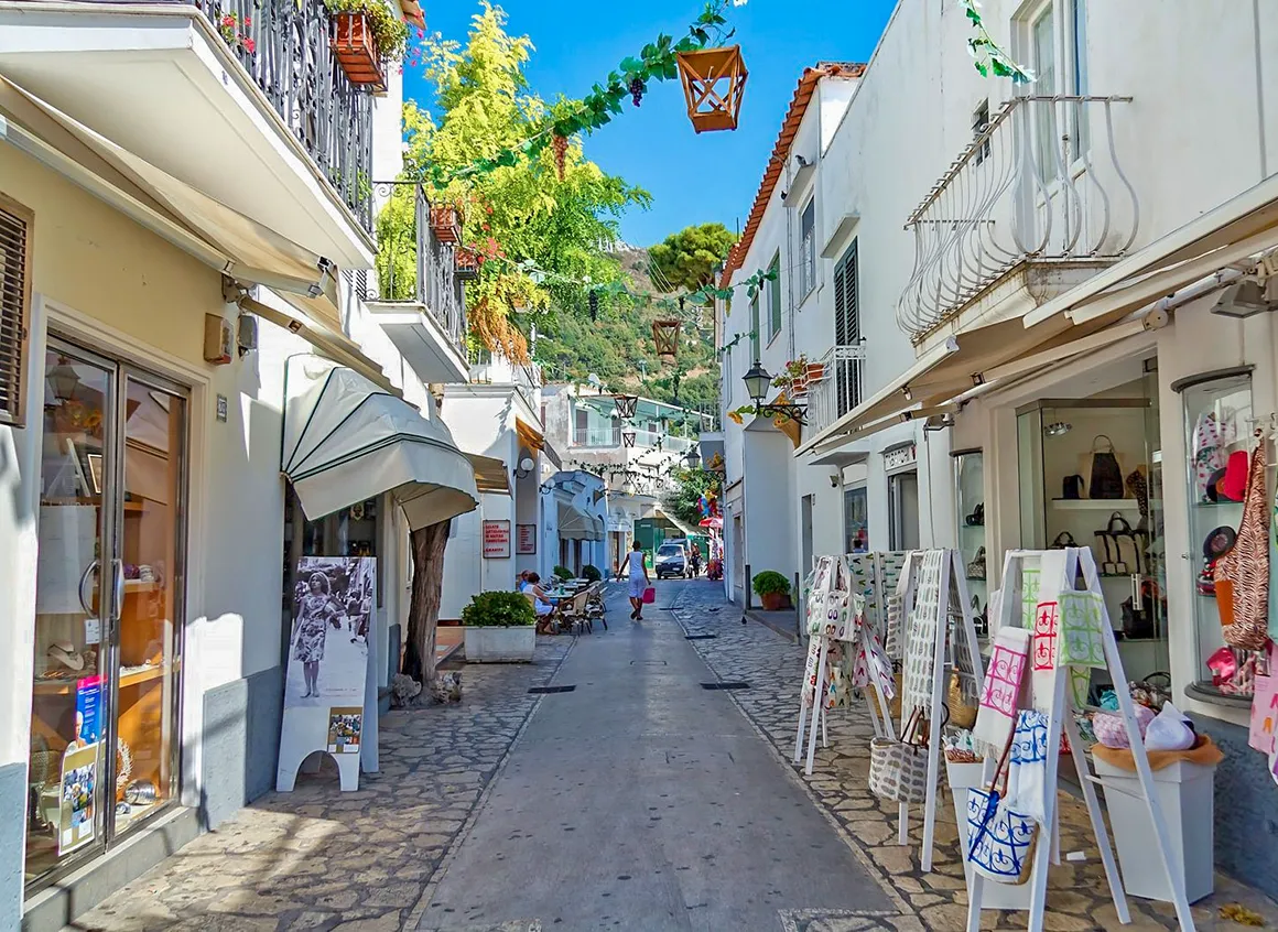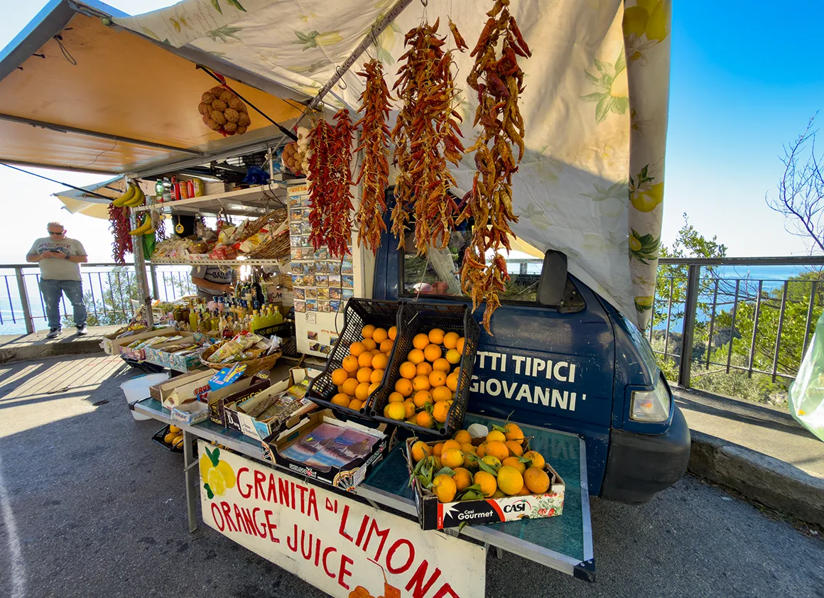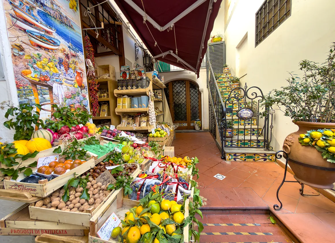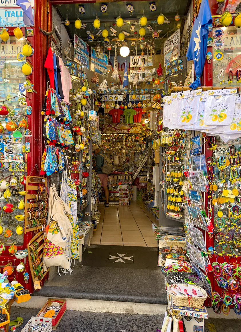 Der erste Eindruck? Zitrusduft in der Nase, Zitronen in der Auslage, Zitronen auf Postkarten, Zitronen in Flaschen, Zitronen als Kühlschrankmagneten. Wer hier keine Lust auf Limoncello bekommt, ist innerlich tot. Wir schlendern durch enge Gassen, vorbei an übervollen Auslagen: Gewürze, Pasta in allen denkbaren Formen (und auch ein paar eher undenkbaren), Keramik, Tücher, Magneten – ein Farbenrausch, als hätte jemand mit dem Pinsel auf LSD gemalt.