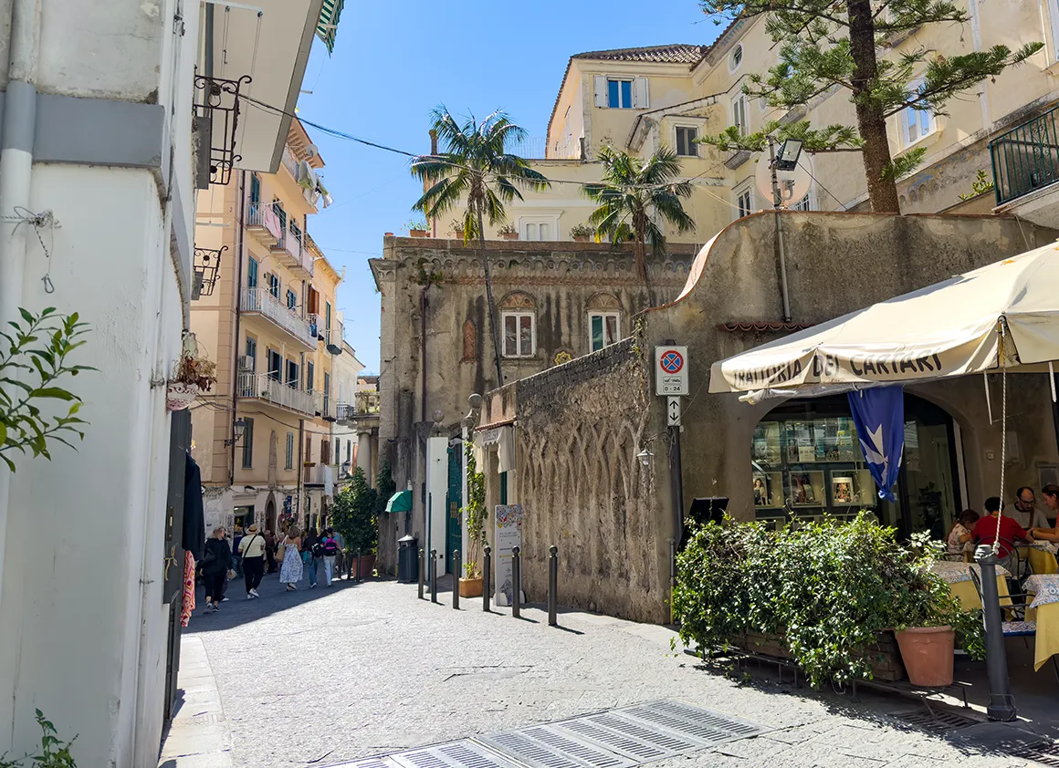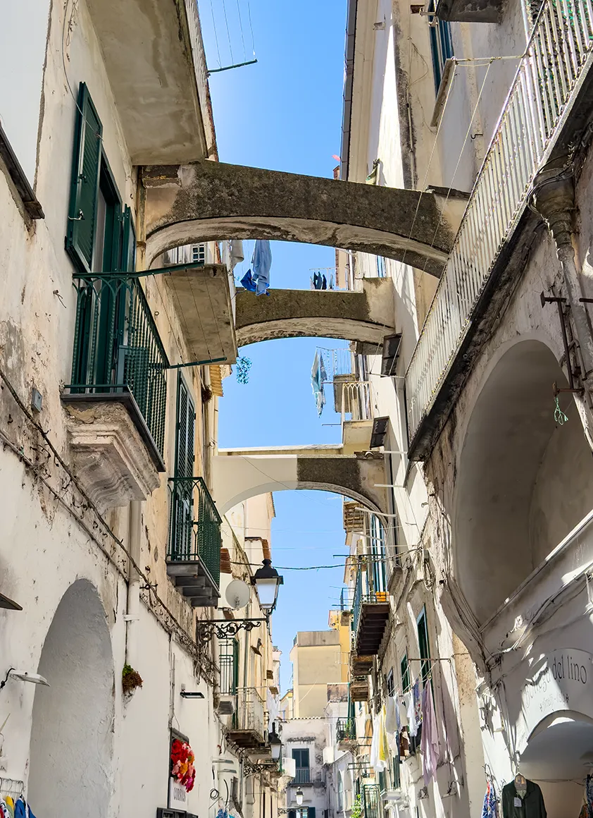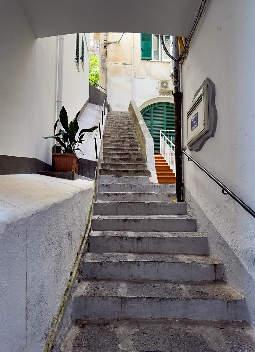 Nach dem Mozzarella-Fest in der Piazza dei Dogi lassen wir uns treiben – Amalfi empfängt uns jetzt von seiner stilleren Seite. Ein schmaler Aufgang, den man leicht übersehen könnte, führt in ein Viertel, das wirkt, als hätte jemand den Pausenknopf gedrückt. Wir steigen Stufe um Stufe, vorbei an vermoosten Mauern, schattigen Torbögen und Innenhöfen mit flatternder Wäsche. Eine Katze rekelt sich auf einer Fensterbank, eine andere jagt imaginäre Mäuse im Schatten. Amalfi kann auch flüstern.