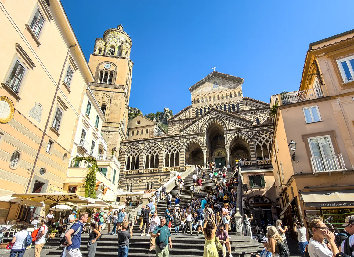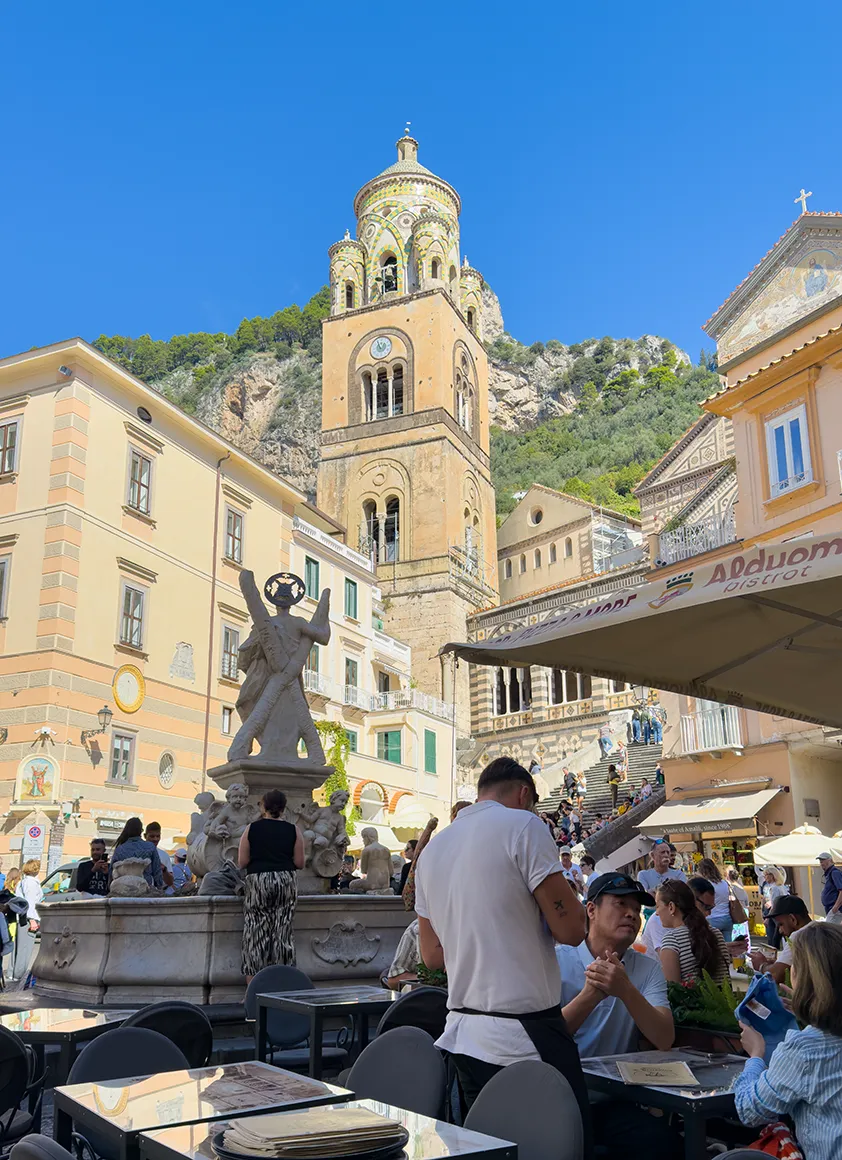 Doch der Sog der Piazza ist zu stark – wie ein Magnet zieht er uns zurück ins Herz der Stadt. Und dort wartet sie schon: die Kathedrale di Sant’Andrea, imposant wie eine Filmkulisse, thronend über der Piazza wie eine Diva in der ersten Reihe. Die breite Treppe davor ist besetzt – nicht mit Gläubigen, sondern mit einem Cast aus Influencern, Selfiejägern und Strohhut tragenden Sommerromantikern, die allesamt das perfekte Amalfi-Bild inszenieren wollen. Fehlt nur noch die Titelmusik von „La Dolce Vita“.