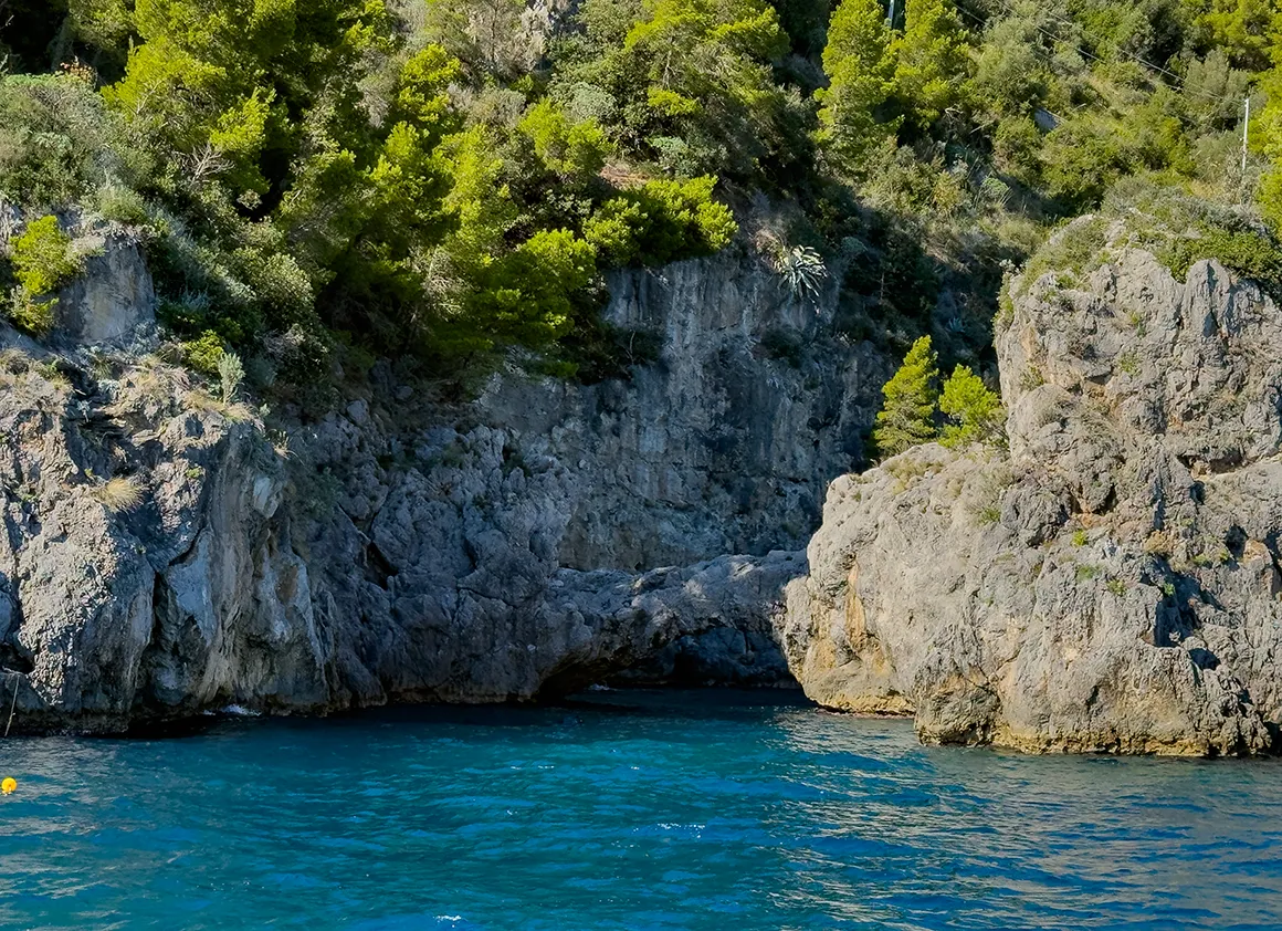 Wenige Minuten nach dem Ablegen – vielleicht zwanzig, höchstens dreißig, wir haben nicht auf die Uhr geschaut – schmiegt sich unser Ausflugsboot plötzlich an einen kleinen Felsvorsprung der Küste. Hier, wo der Fels wie ein nachlässig geworfener Umhang ins Wasser hängt, befindet sich der Eingang zur Grotta dello Smeraldo – der Smaragdgrotte.